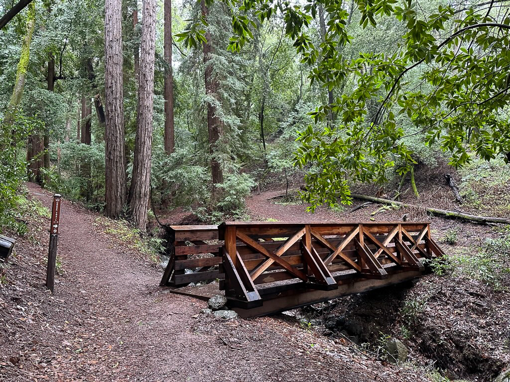 A wooden bridge over Wildcat Creek in a redwood forest is a scenic spot on the Villa Montalvo Loop