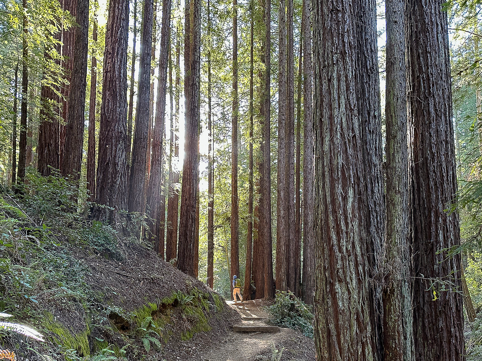The mostly flat Main Trail leads through ancient coast redwoods up to 258 feet tall