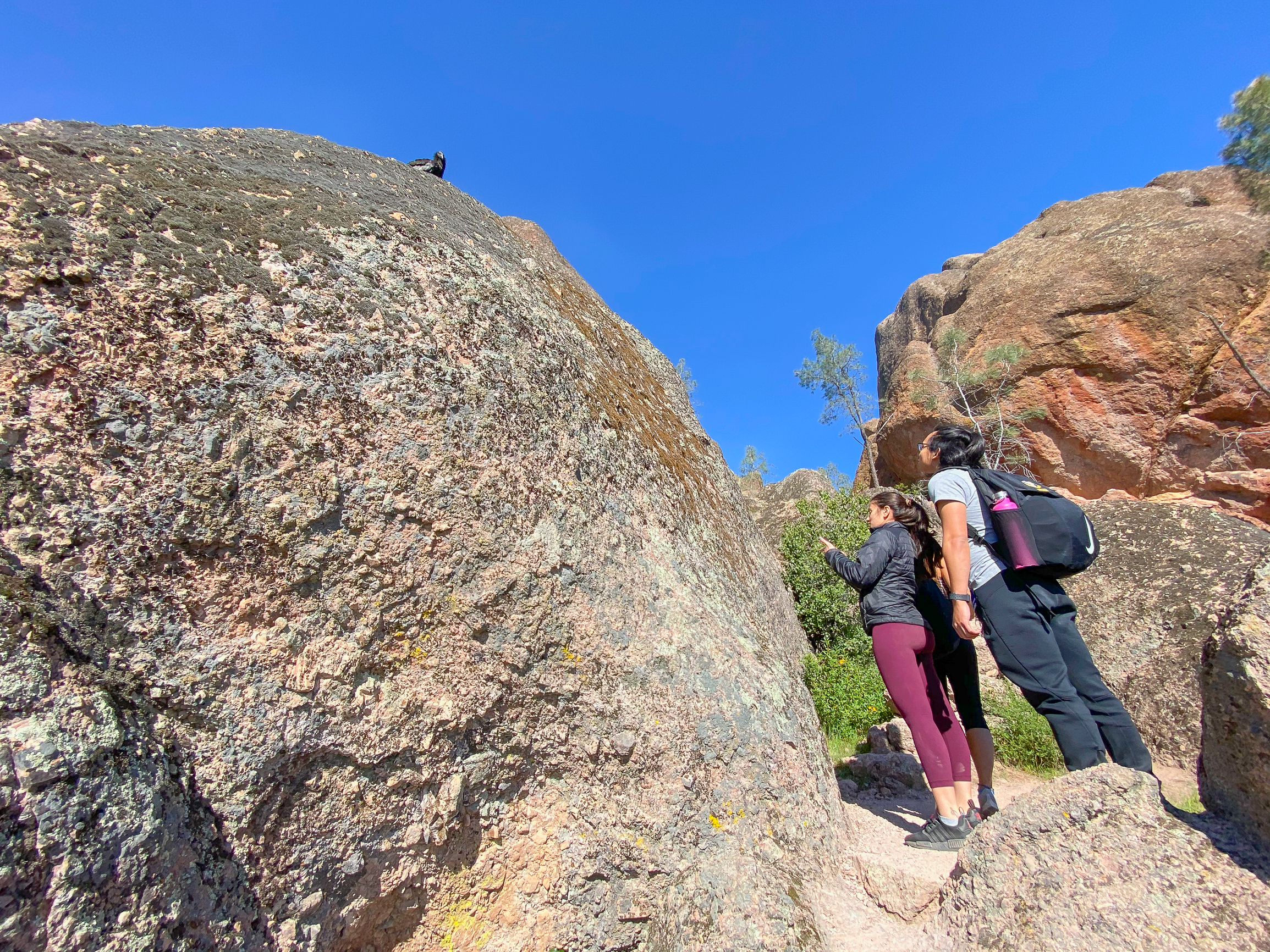 A juvenile California Condor peers down at hikers on the High Peaks Trail in Pinnacles National Park