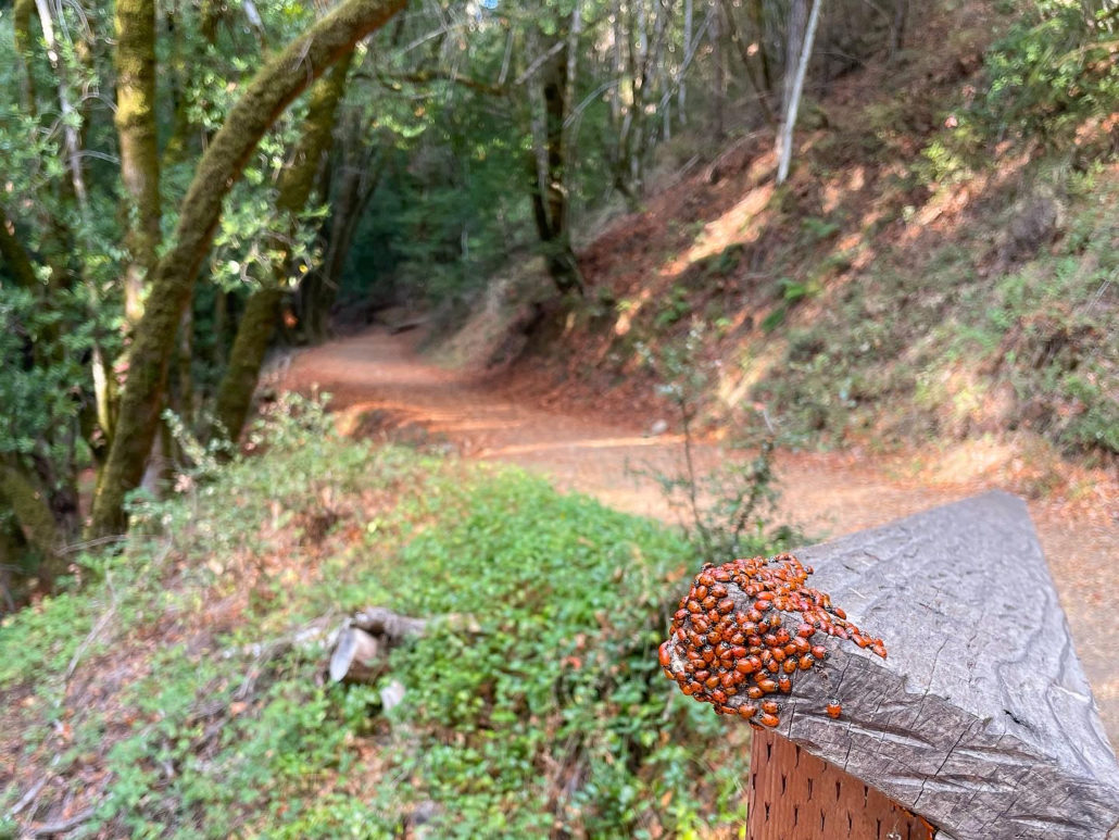 A favorite local hotspot to see them is the Stream Trail in Reinhardt Redwood Regional Park, halfway between the Canyon Meadow Staging Area and Skyline Gate Staging Area. From either Staging Area, hike 1.5 miles toward the Prince Trail and Stream Trail junction. Just south of the junction, look carefully under leaves and on fences for ladybugs clustering together. Another hike to try your luck is the Uvas Canyon Waterfall Loop in Morgan Hill. You can find them clinging to trailside shrubs and wooden bridges on the Waterfall Loop Trail toward Upper Falls.