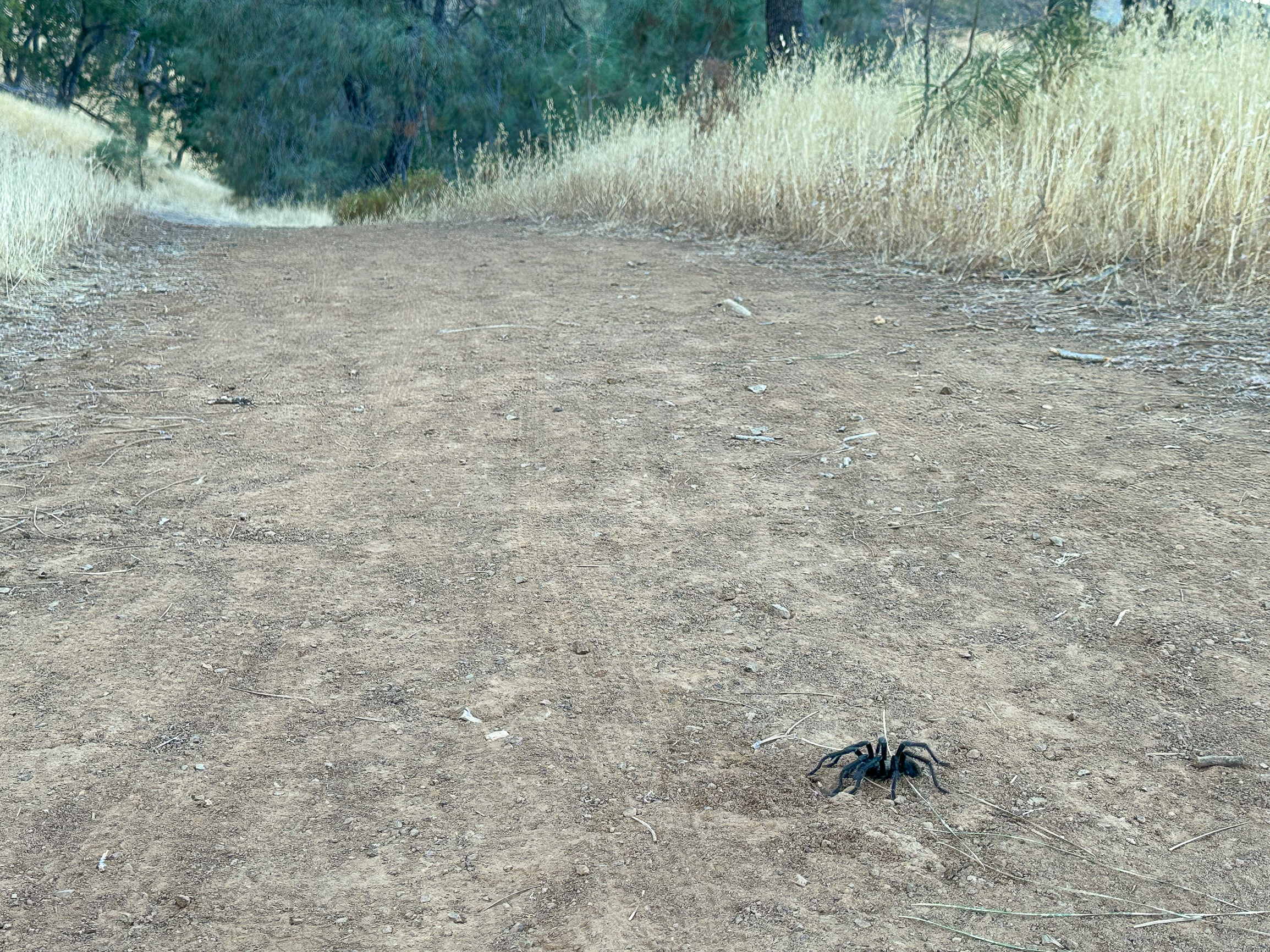 A tarantula wanders along a trail near sunset in Mount Diablo State Park