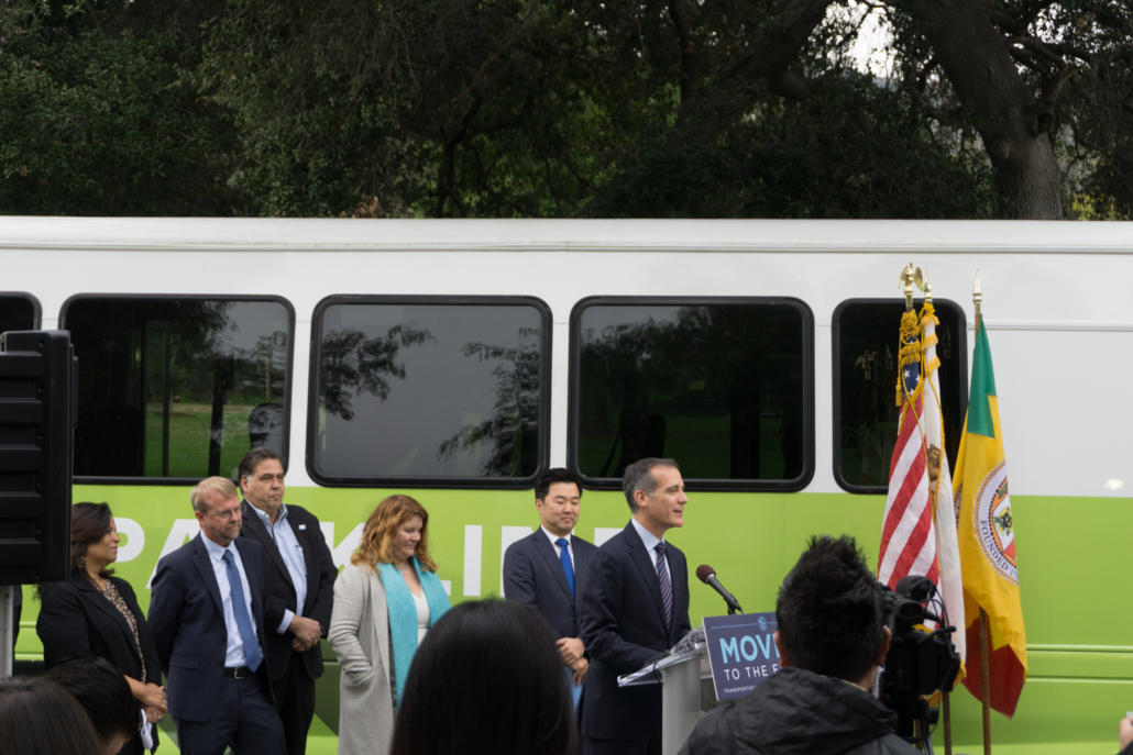 Mayor Garcetti, Councilmember Ryu, Superintendent Salaices and others launch the Parkline shuttle bus on Dec 3, 2019