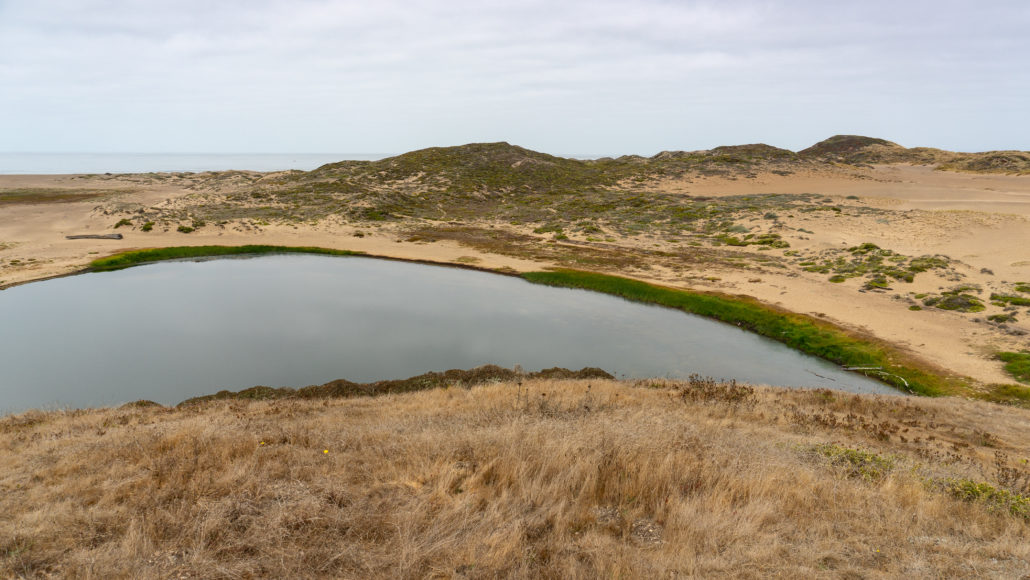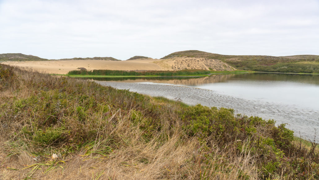 Beyond the first wooden bridge, at 0.5 miles, is a wooden bench and overlook to the north wing of Abbotts Lagoon. There are two Abbott brothers and coincidentally, Abbotts Lagoon has two wings: a large “south wing” by the ocean and the “north wing” that you see on the first part of the hike. The wings are joined in a narrow section at the 1.1-mile mark where a wooden bridge crosses over it. Altogether, the lagoon encompasses 282 acres.