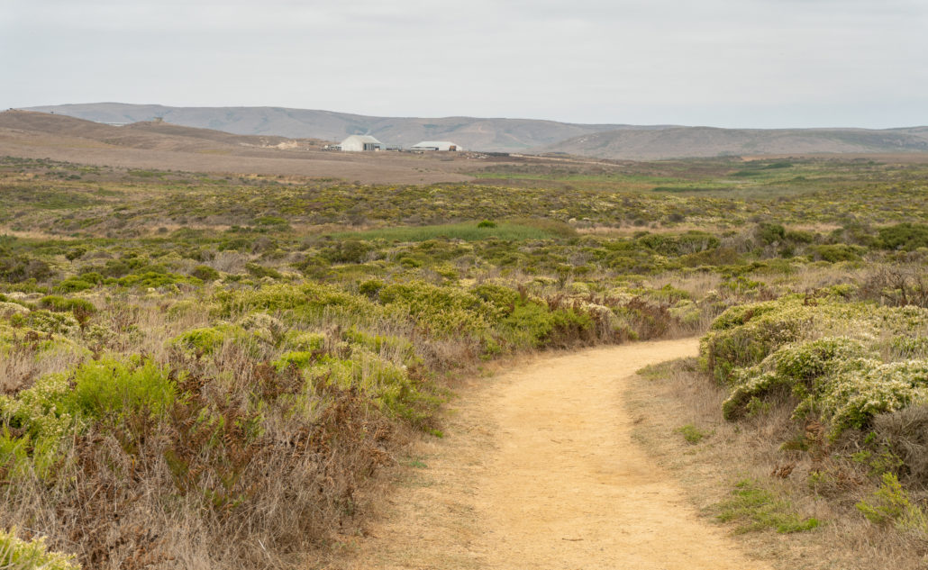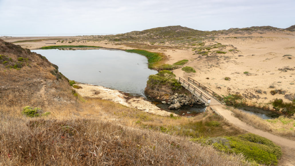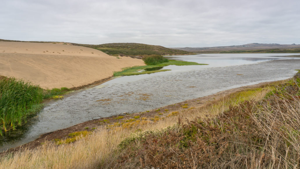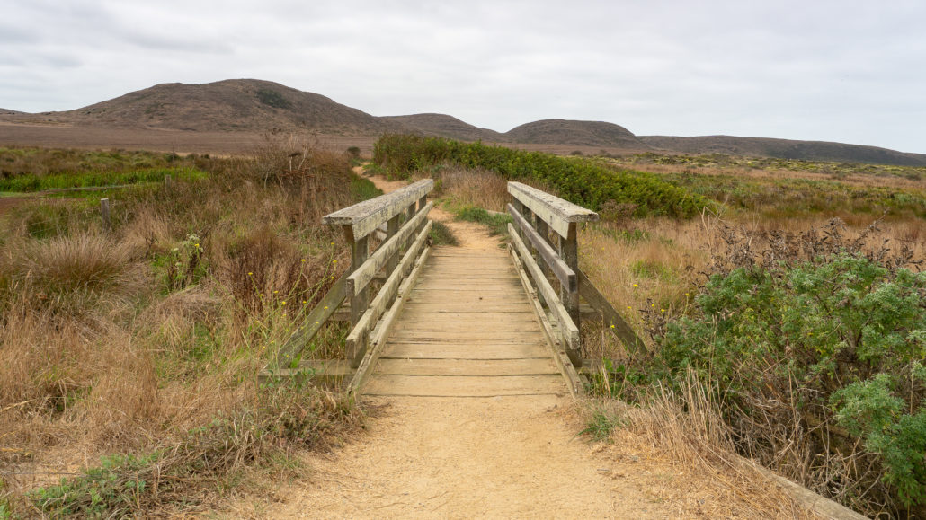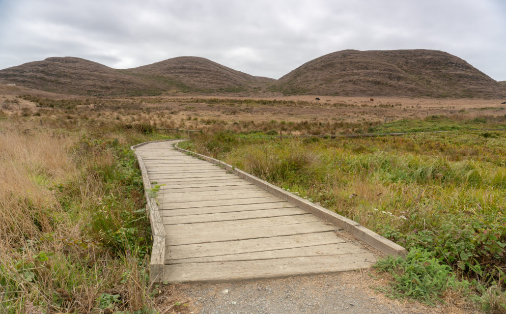Abbotts Lagoon is a gently rolling trail past grazing lands and a lagoon for the first 1.1 mile. There are wooden bridges, a wooden boardwalk, and dirt paths. Past the lagoon bridge, there is an unmaintained trail towards the beach that transitions to shifting sand. It is 0.5 miles from the lagoon bridge to the ocean.
