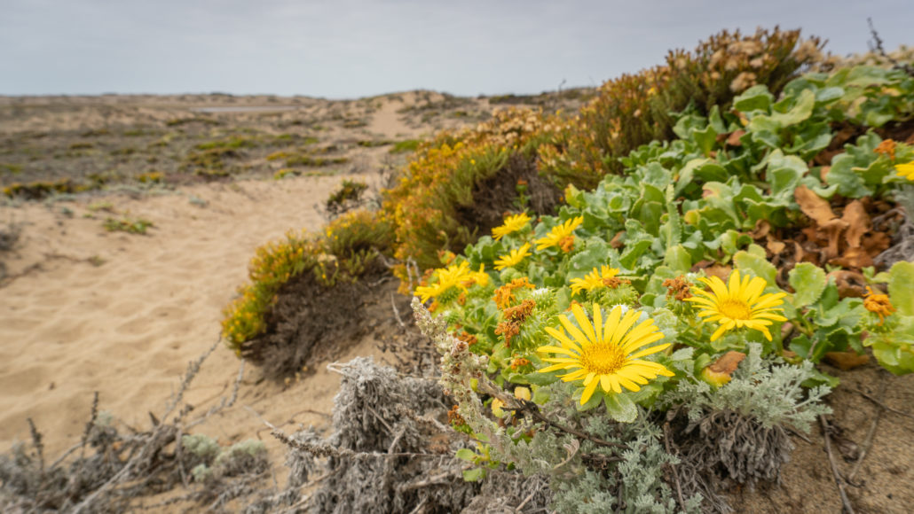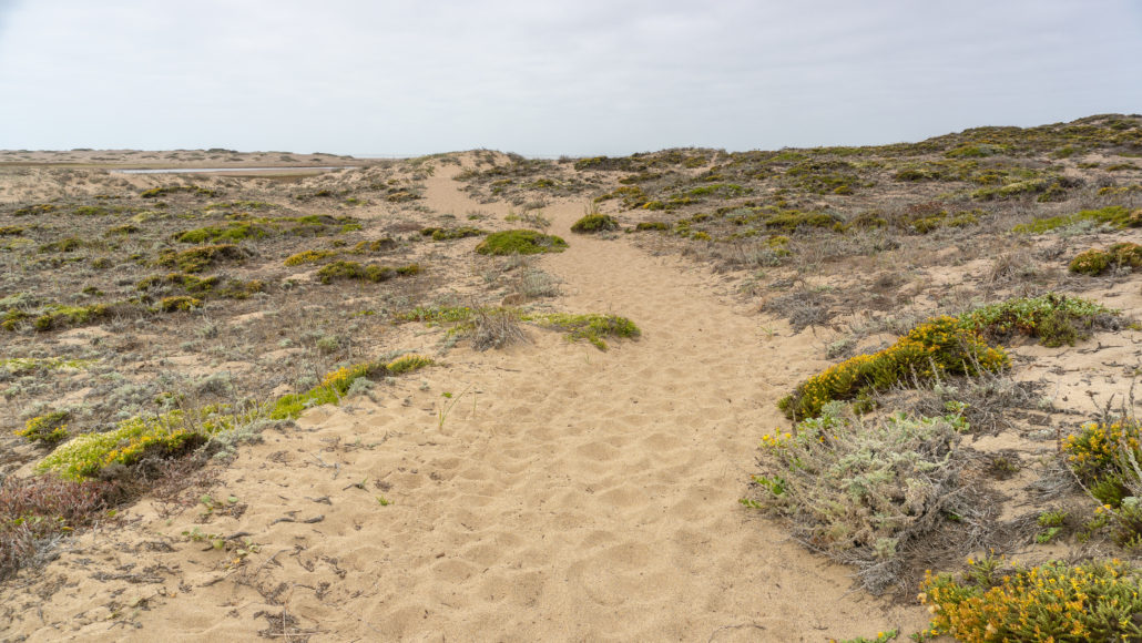 Past the wooden footbridge is a vague outline of a trail to your right. Follow this path west. When it fades out, continue west on beachy sand to the Pacific Ocean, skirting the northern edge of Abbotts Lagoon. At your feet among the sand dunes are yellow gumplant, a member of the sunflower family.