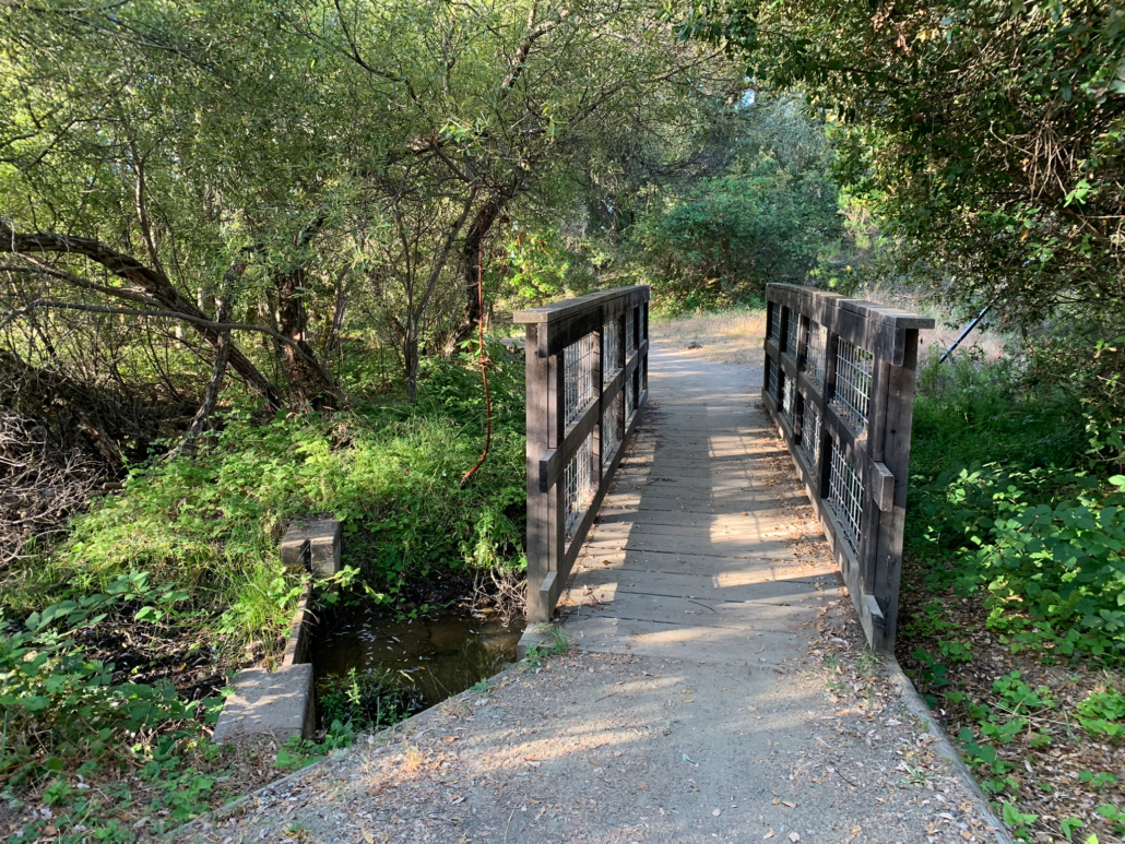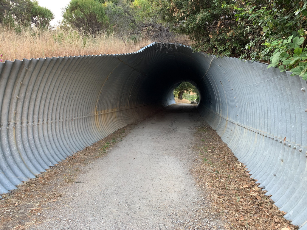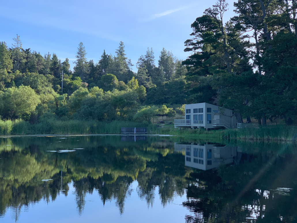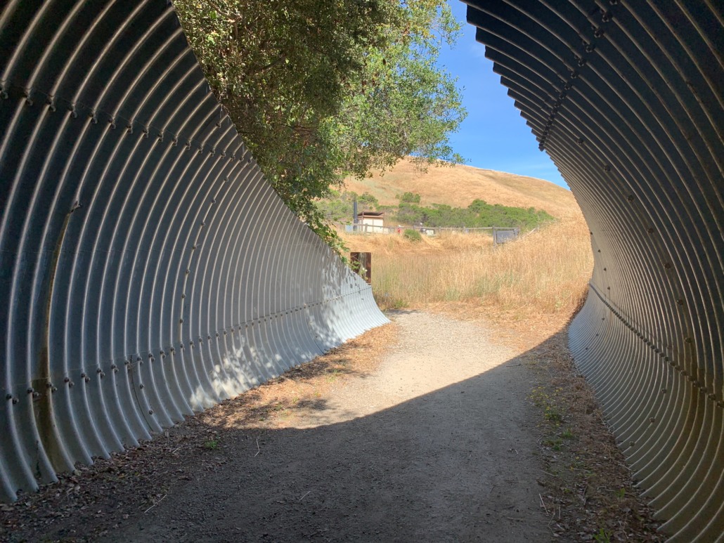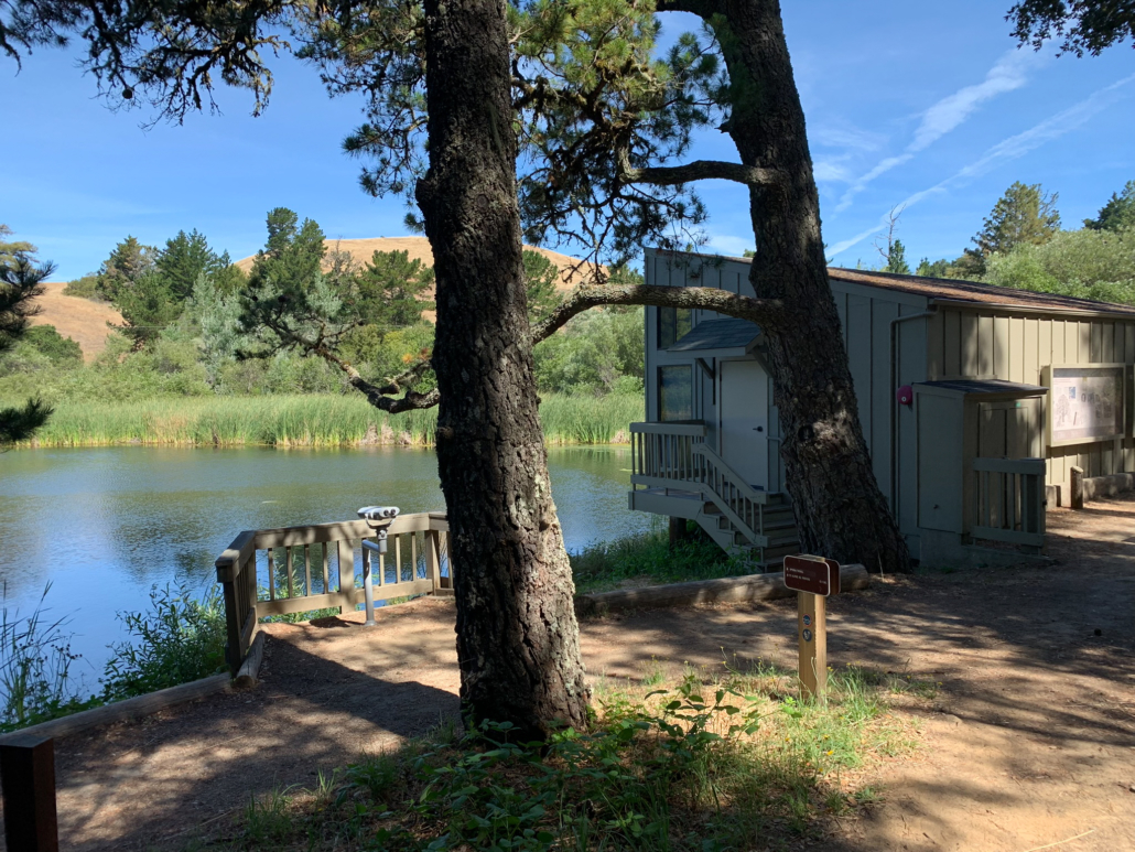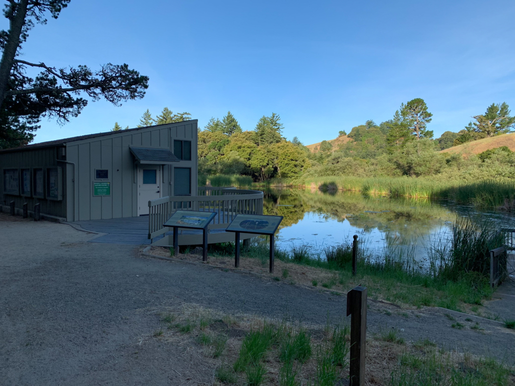 At 4.8 miles, return to the David C. Daniels Nature Center. Enjoy the pine-framed view of the pond, and peek through the binoculars to see if you can spot wildlife. Panels on back of the Nature Center share information about Skyline Ridge Preserve’s history, wildlife, and happenings at Midpen preserves. Retrace your steps back to the Russian Ridge parking lot, bearing right past the picnic tables and then left at the split in the trail, passing through tunnel once more.