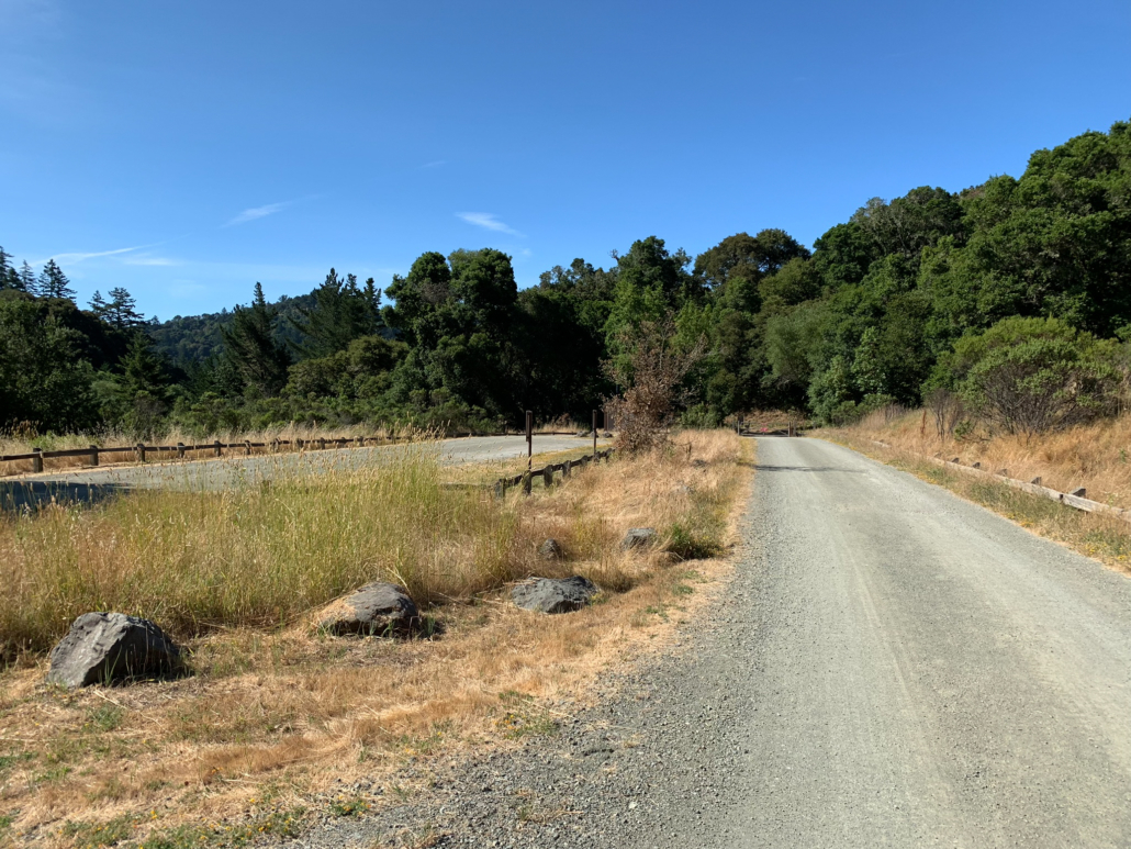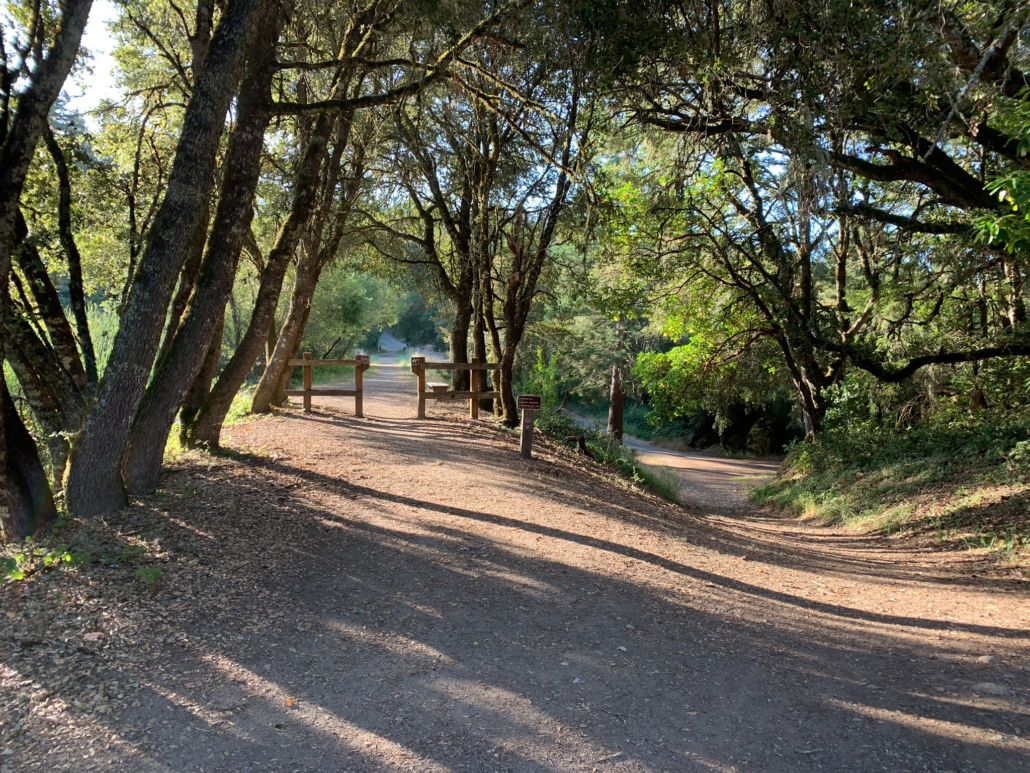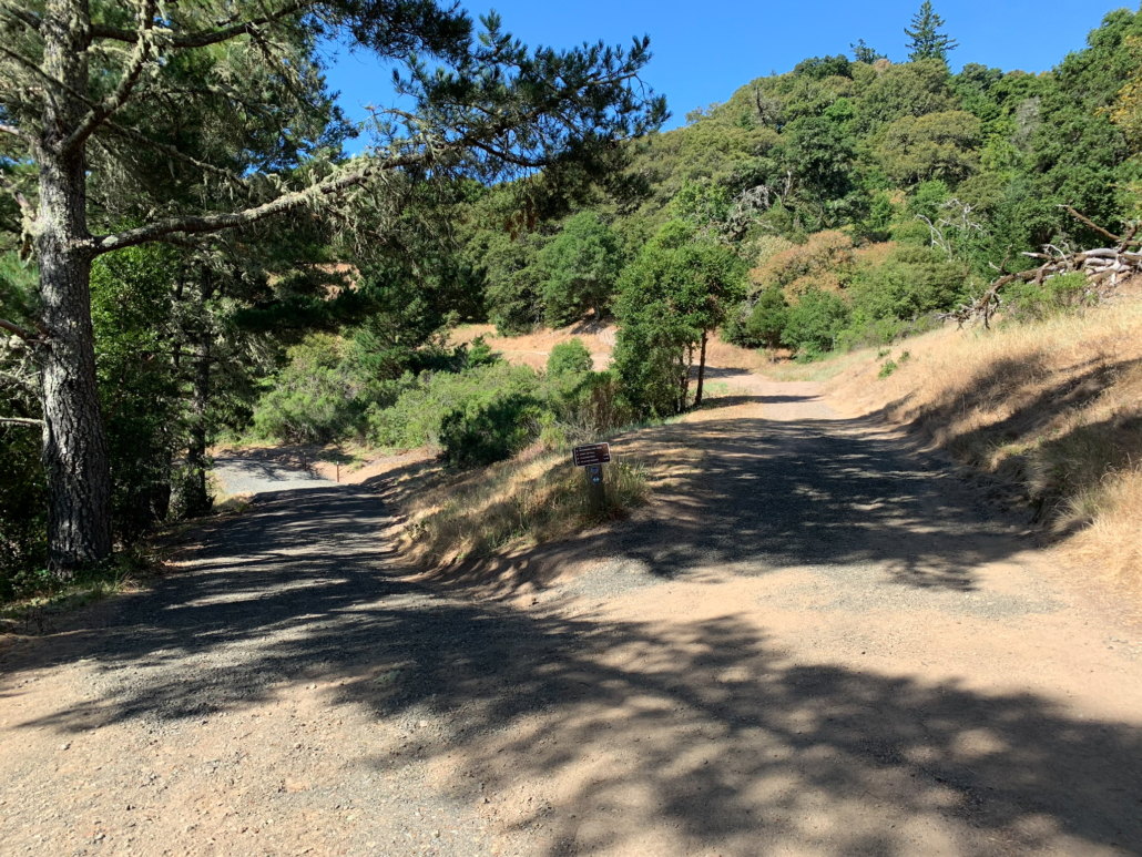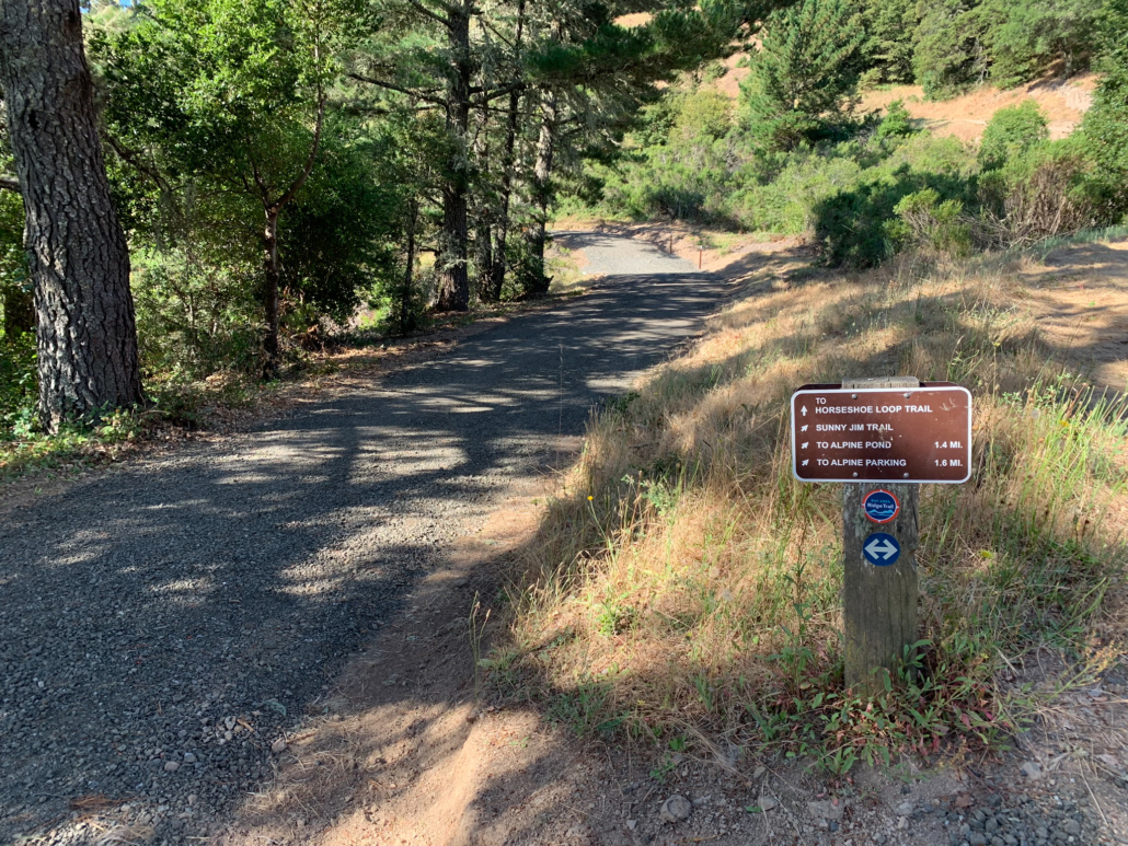 When ready, retrace your steps to the Alpine Pond Trail, where you have a pretty view of the Nature Center. Just beyond this viewpoint, stay straight past a restroom onto a gravel road. This road is the Sunny Jim Trail, named after James Rolph, Jr., a former San Francisco Mayor (1912-1931) and California Governor (1931-1934) who owned land here before John Rickey. His nickname, “Sunny,” was given to him because of his trademark happy character.