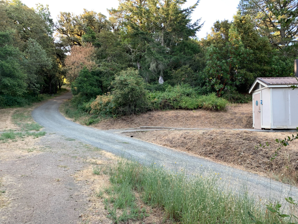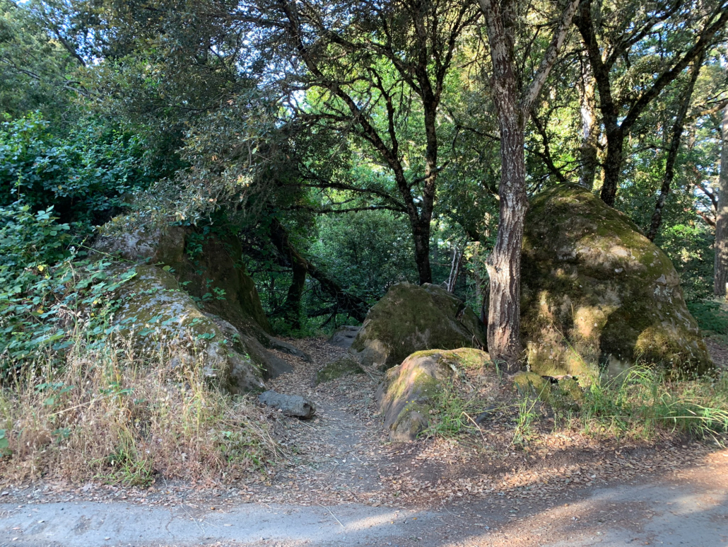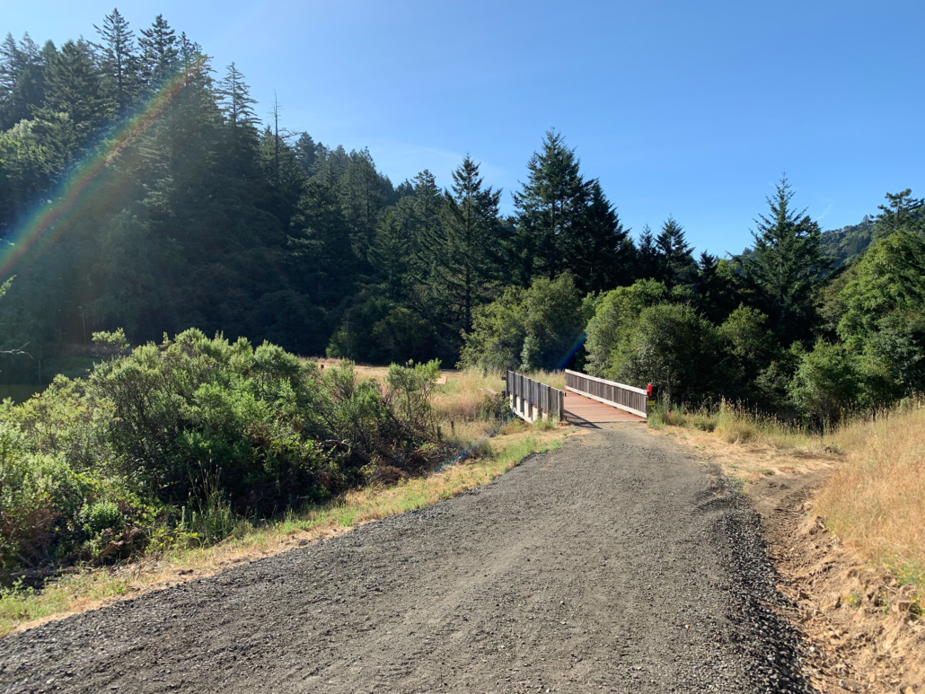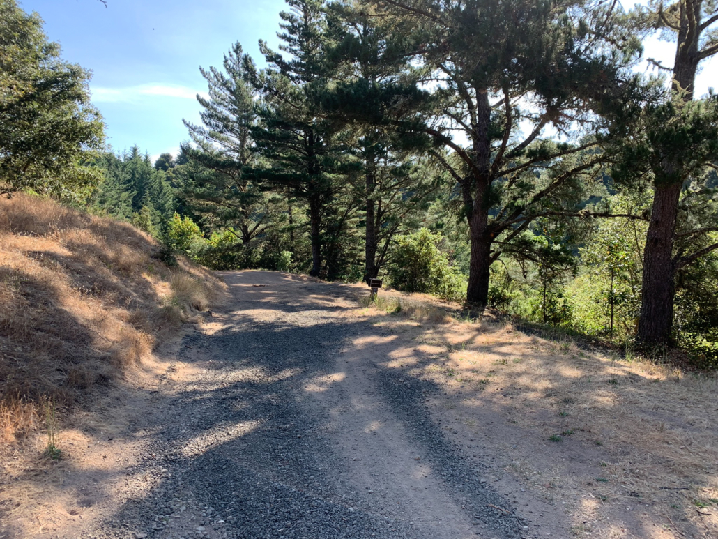When ready, retrace your steps to the Alpine Pond Trail, where you have a pretty view of the Nature Center. Just beyond this viewpoint, stay straight past a restroom onto a gravel road. This road is the Sunny Jim Trail, named after James Rolph, Jr., a former San Francisco Mayor (1912-1931) and California Governor (1931-1934) who owned land here before John Rickey. His nickname, “Sunny,” was given to him because of his trademark happy character.