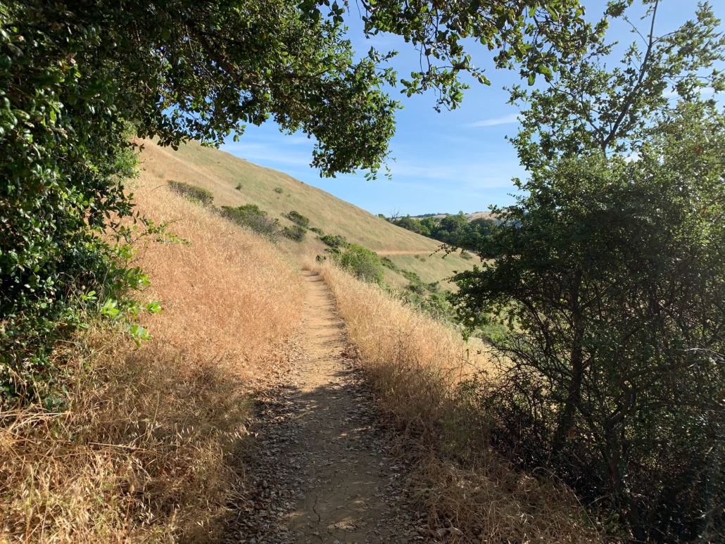 In just 175 feet, turn right onto the Ipiwa Trail towards Horseshoe Lake, heading southeast under shady live oak. Emerge into a sunny, wild oat grassland with miniature lupine and poppies in spring and summer. The trail climbs 200 feet along the western slope of the ridge, transitioning from grassland to chaparral. You may see shy California quail darting into the bushes, with their distinctive hook-shaped crest on the male’s heads. (Tip: listen to the quail’s sounds before you head out to recognize their calls when you hike.)