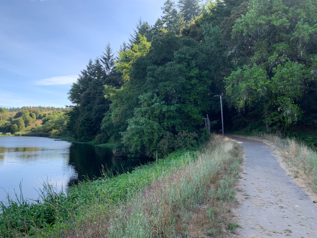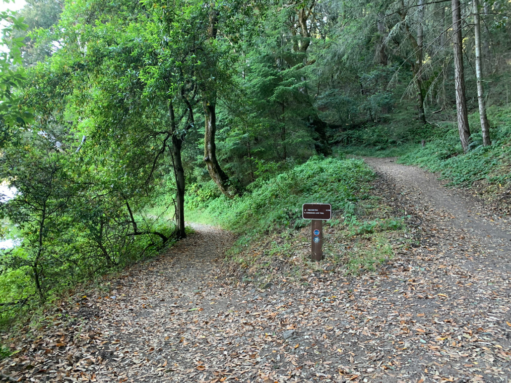 Past the vista, bear left to stay on Horseshoe Loop Trail. This section is shady with lots of greenery—coastal wood fern, sword fern, Douglas fir, and the ever present poison oak. Benches here, at the lake’s edge, are a fine break alternative to the previous bench. This is the lowest point of the hike, and from here, you will gently climb up and away from the lake, past sweet smelling California buckeye.