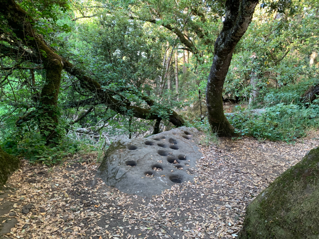From the David C. Daniels Nature Center, turn right onto a narrow gravel path to begin a counter-clockwise loop around Alpine Pond. About three-quarters of the way around, cross a wooden bridge over the pond’s outlet and then bear right at the next junction, heading downhill on the Ridge Trail. In 150 feet, look on your right for a narrow path between boulders. The path leads to a block of sandstone with bowl-shaped holes called bedrock mortars. The Ohlone used these bedrock mortars as recently as the 19th century to grind acorn kernels for food.