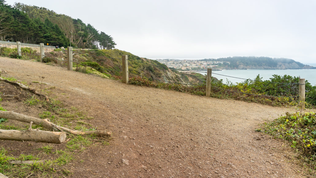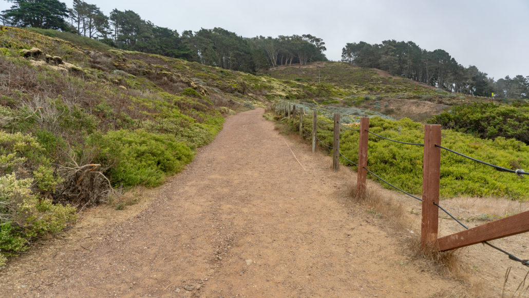 The trail’s beginning and end are next to Lincoln Boulevard, and it is possible to start at either end. You can park on the shoulder of Lincoln Boulevard near the southern tip of the trail, but parking is limited. (See Notes below for the location of that parking area). Instead, this trail description starts at the northern end of the trail in the Langdon Court parking lot. The Golden Gate Overlook is only steps away, as well as Batteries Godfrey, Boutelle, and Marcus Miller. Trails connect to the batteries, the Golden Gate Bridge, and the Golden Gate Bridge Welcome Center (great souvenirs there) from the parking lot.