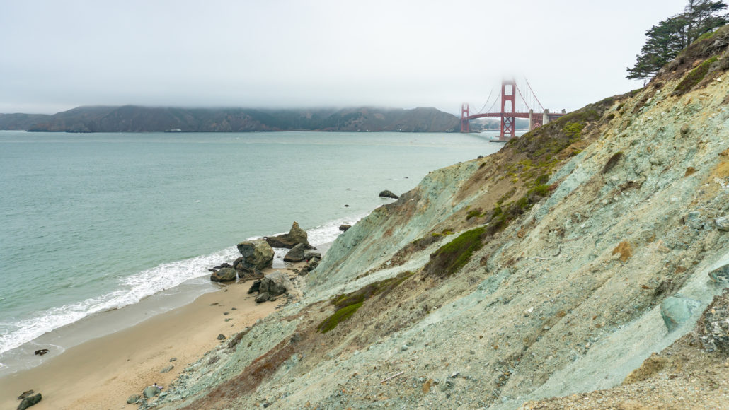 At 0.3 miles, reach an overlook. Marshall’s Beach is down below, Point Bonita Lighthouse to the west, and the Golden Gate Bridge to the north. The blue-green color you see on the bluffs is serpentine, California’s state rock.