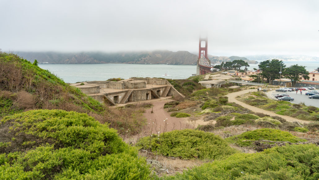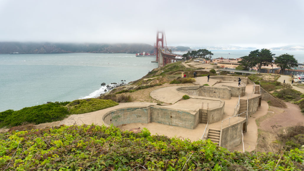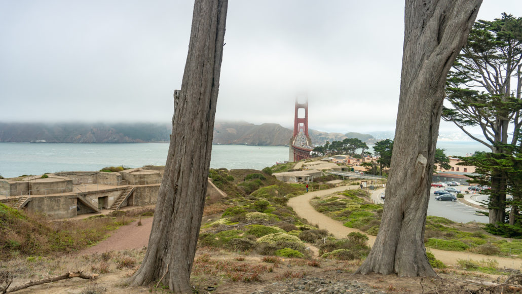 Start your hike by heading north to the Golden Gate Overlook. Here you’ll see a much-photographed view of the Golden Gate Bridge between two cypress trees. You can see the trails here leading down to Battery Godfrey and connecting to its northern battery neighbors. The benches and overlook area here were remodeled in 2012, along with the Pacific Overlook, to celebrate the Golden Gate Bridge’s 75th anniversary.
