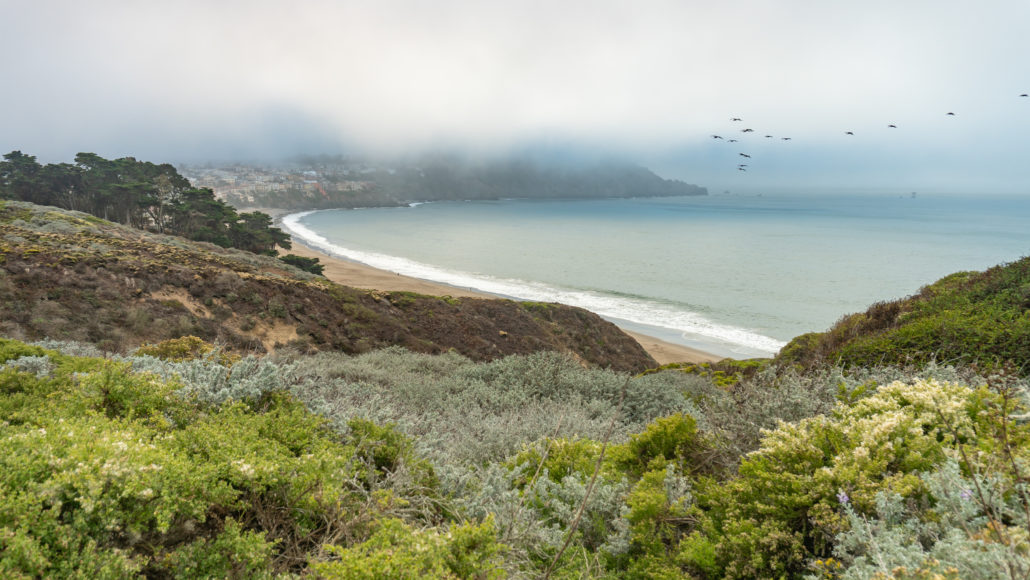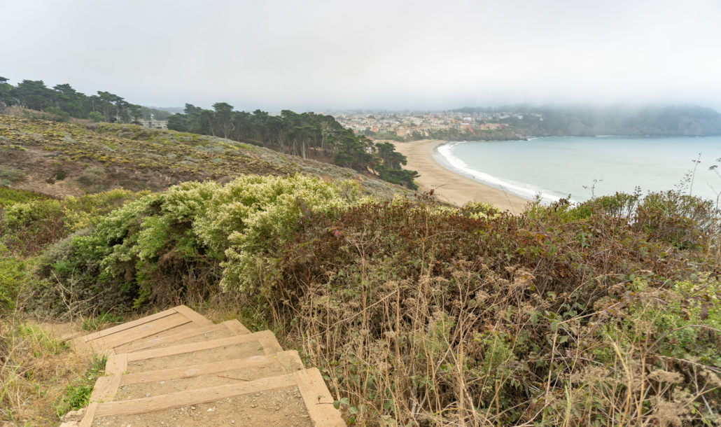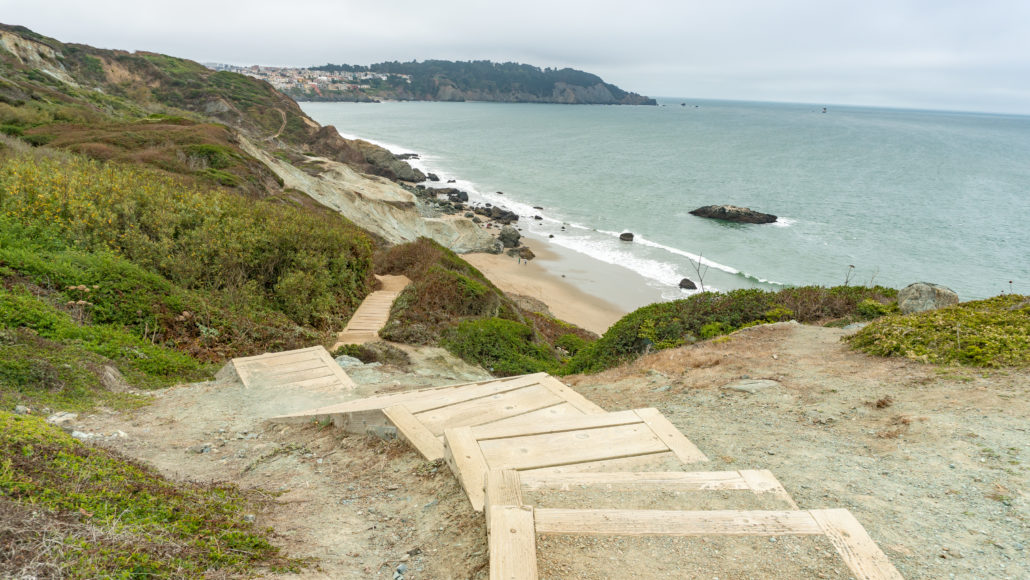 The Batteries to Bluffs Trail is a quintessential San Francisco hike on the western bluffs of the city, steeped in history and classic, coastal views. At 1.7 miles round-trip, it is short enough to roll into your San Francisco sight-seeing day, or better yet, in the evening at sunset. The hike is moderately steep, with wooden steps carved into the bluff. The rewards for your efforts are views of the Golden Gate Bridge, historic batteries, and secluded Marshall’s Beach. The Batteries to Bluffs Trail is part of the The Presidio, which lies within the Golden Gate National Recreation Area.