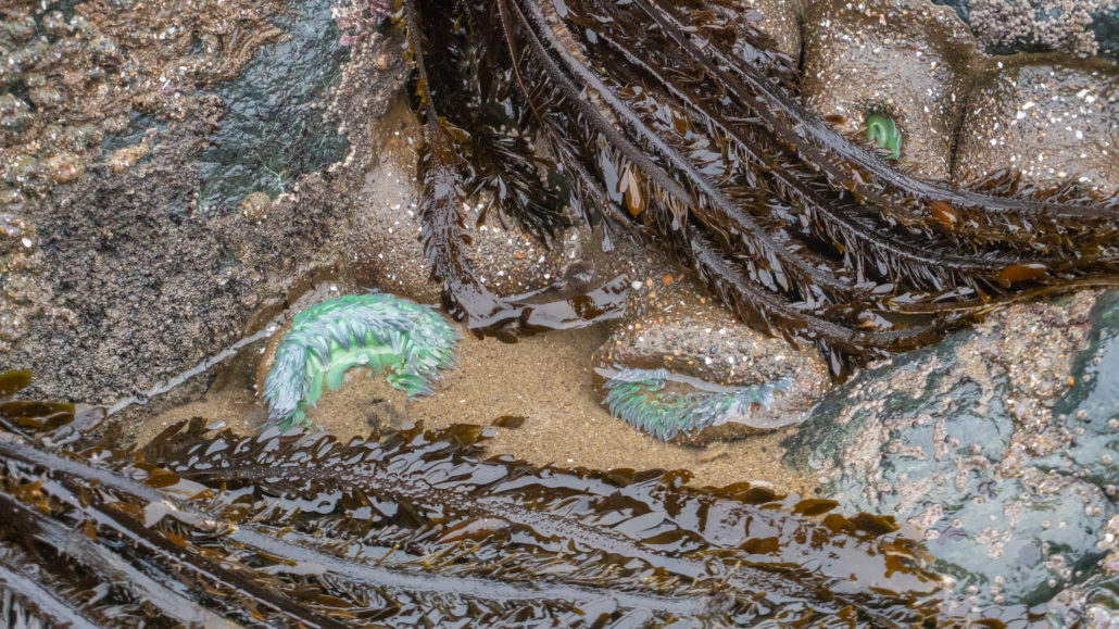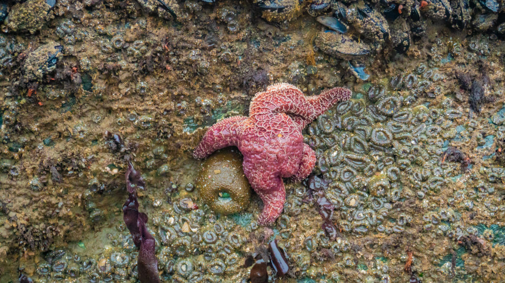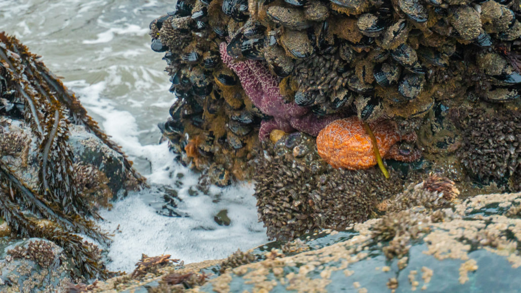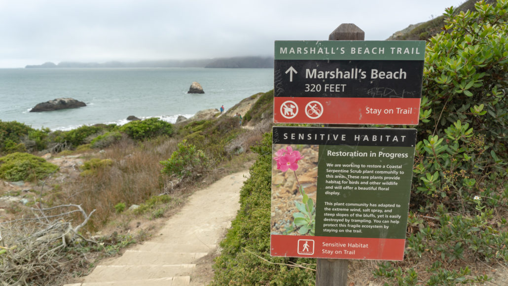 At low tide, you can hike for nearly 0.6 miles one-way along the beach. Time your hike for low tide and you can even go tide pooling. Low tide also helps you pass through a strip of rocks (seen in the photo above) to the northern part of the beach. At the very northern section of Marshall’s Beach, if you look closely and carefully, you may spot bright orange and purple starfish, along with fluorescent blue anemone.