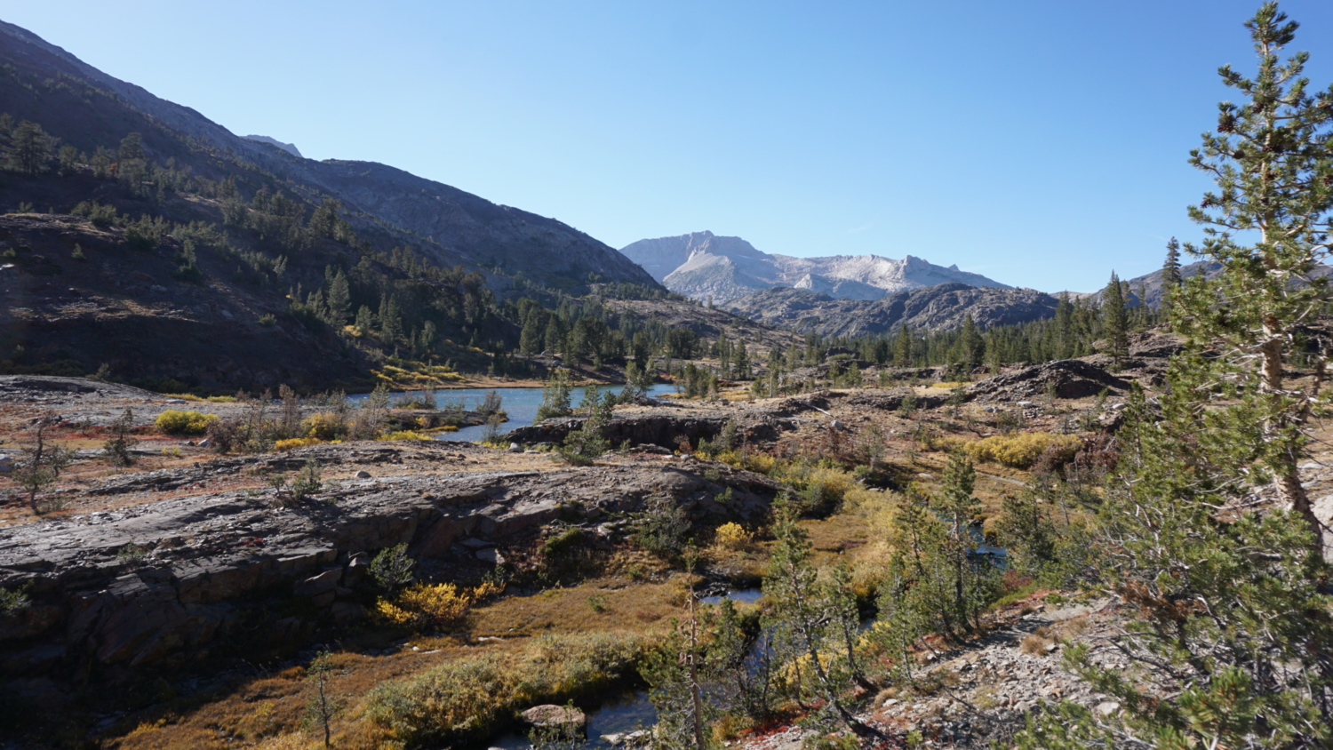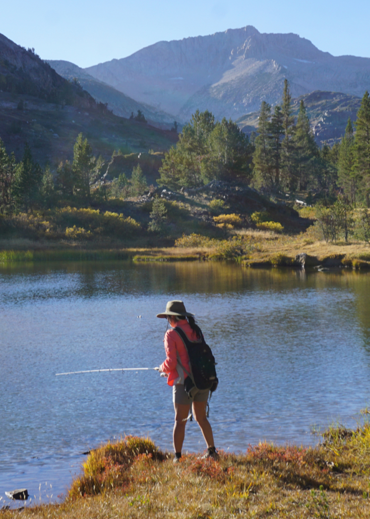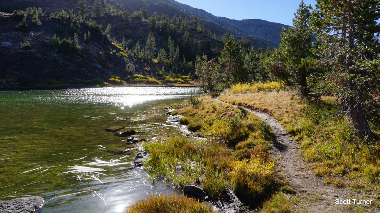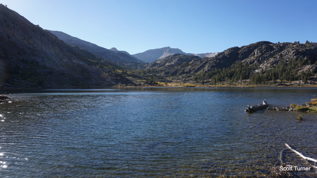 At 1.75 miles, the hike comes to an end at the base of Fantail Lake. Fantail is largest and prettiest of the three lakes, and Mount Conness punctuates the scenery with a 12,590′ exclamation mark atop the Sierra Crest to the northwest. Geology nerds can compare the gray granite of Conness with the more common rust-colored metamorphic rocks underfoot. These metamorphic rocks held an association with precious minerals like gold and silver, and most Eastern Sierra mines lie within this rock band. The metamorphic rocks are relatively rare in the Sierra, as the younger underlying granite pushed most of those rocks upward while erosion and run-off washed them away into the Central and Owens Valleys. Outcrops such as those found at the Tioga Pass area are known as roof pendants.