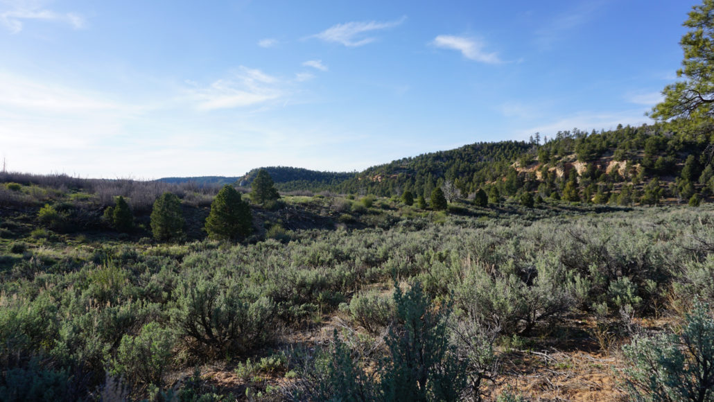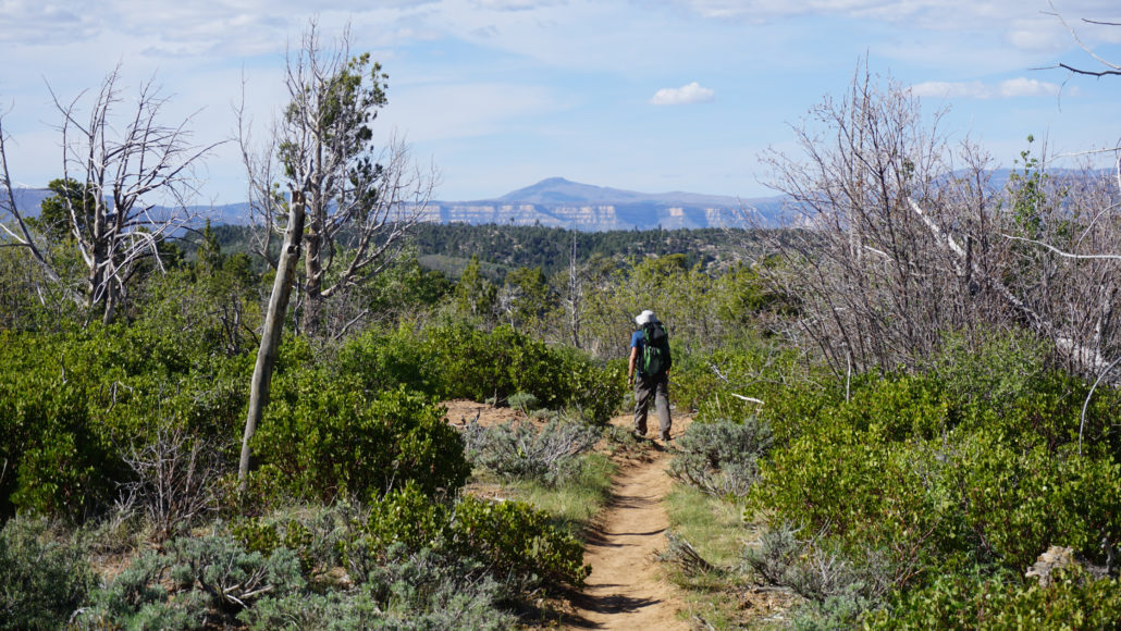 The approach to Cable Mountain is a bit unusual in that you actually descend to the top of the mountain. The trail tops out just to the east of Peak 6940 at 2.25 miles before beginning a lengthy descent. The first 0.6 mile of the descent follows a relatively mellow incline downhill through a dense forest of pinyon pine and Utah juniper. The grade steepens appreciably starting at a switchback at 3.1 miles before becoming less severe on the final descent.