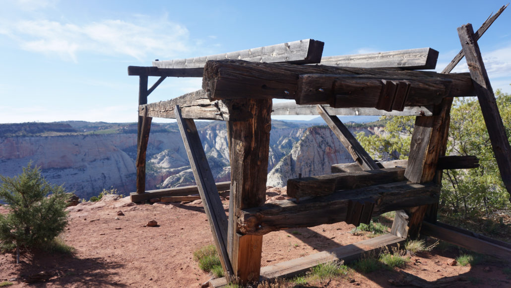 At 3.6 miles, the trail bottoms out at a flat clearing just above the rim of Zion Canyon. At this point, you will see the cable works structure, along with several leftover beams that have been stacked around the flat former site of the cable works operation. Please do not climb on or otherwise disturb the cable works as they are a fragile historical landmark.