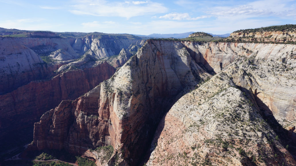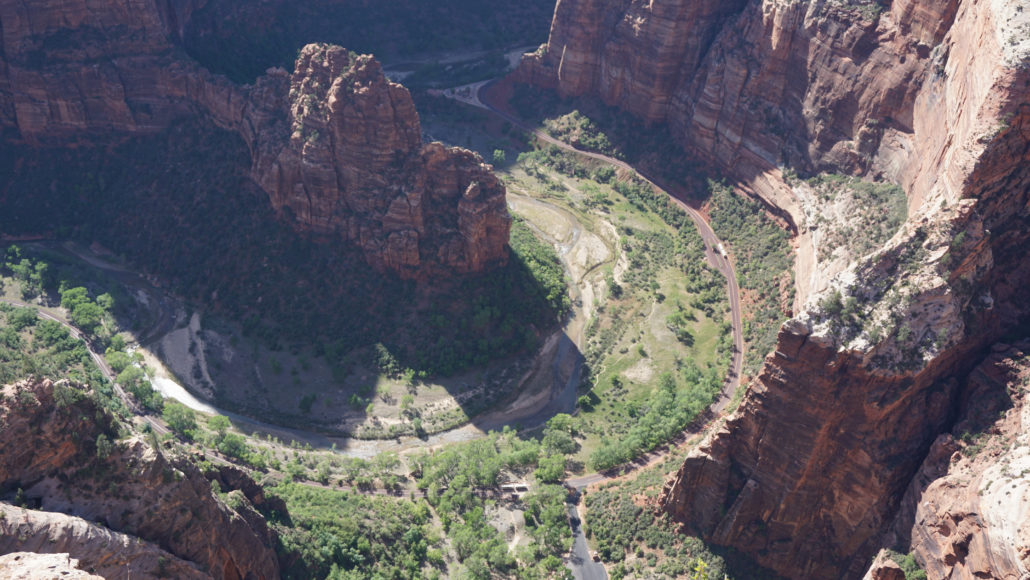 The Organ, the Weeping Rock Trailhead, and the Virgin River from the edge of Cable Mountain