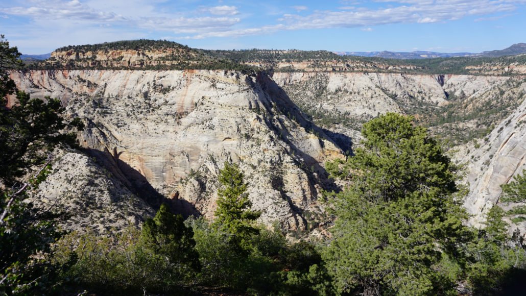 If you take the time to peer into the history of any given National Park, chances are that you will come across some slightly ridiculous scheme to solve some seemingly insurmountable challenge. At Zion National Park, such a scheme resulted in a convoluted cable works system designed to transport timber from the wooded highlands of East Mesa down to the canyon floor to aid and abet the construction of the Zion Lodge. The cable works went into use around the turn of the 20th century, and through their help, the original developers of then Mukuntuweap National Monument used the cables to lower ponderosa pine timber down a 2,300-foot sheer cliff to the relatively timber-poor canyon below. The original structure still remains standing upon the lip of Cable Mountain, and this hike leads you on a satisfying journey across a forested plateau to a point where you can tiptoe to the very rim of Zion Canyon.