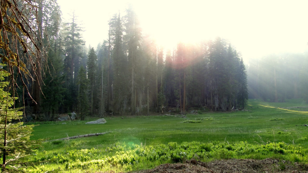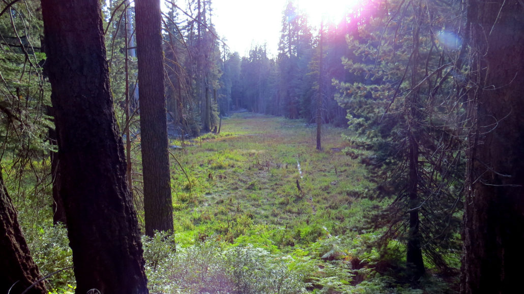 At the heart of Giant Forest lies a roughly C-shaped meadow formed by two arching tributaries feeding Little Deer Creek. As the two tributaries trickle down a gentle slope around the north and south side of a wooded knoll, they create marshy conditions perfect for supporting the lush assortment of grasses, herbs, and wildflowers characteristic of Giant Forest’s meadows. This lasso-loop around both legs of the meadow thoroughly explores this gem in the heart of the forest.