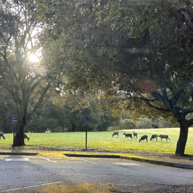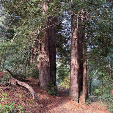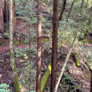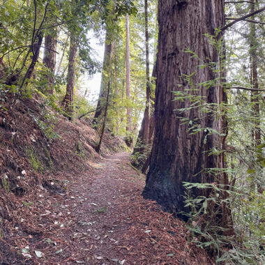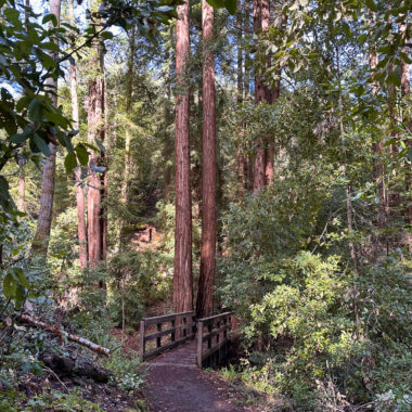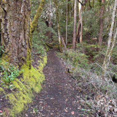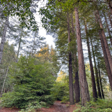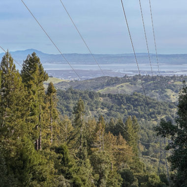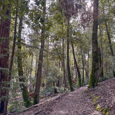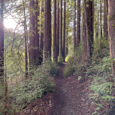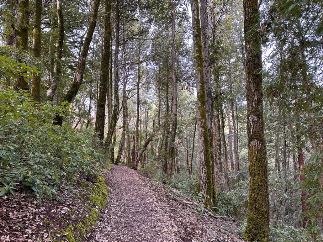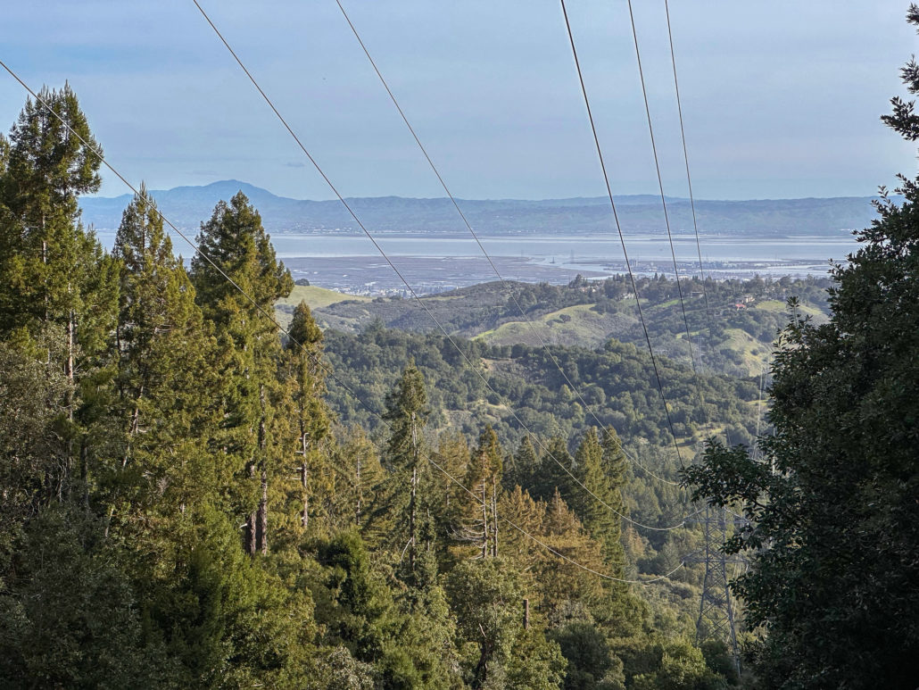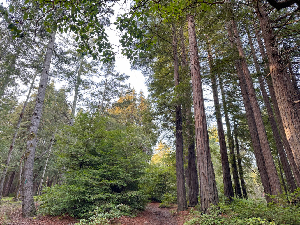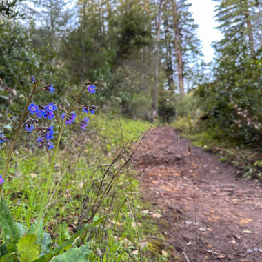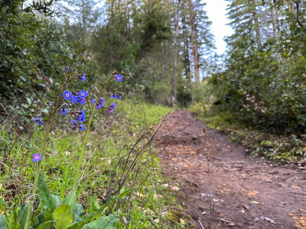 There’s an airiness to the forest that allows sunlight to filter through trees and makes the surrounding landscape glow. If I had to pick a theme for this hike, sunlight-filtering-through-the-trees would be it. Birds like juncos and towhees chirp and tweet up in the canopy. At a break in the trees, you can just make out the San Francisco Bay to the east. In springtime, wildflowers like Pacific Hound’s Tongue add a pretty pop of color to the forest.