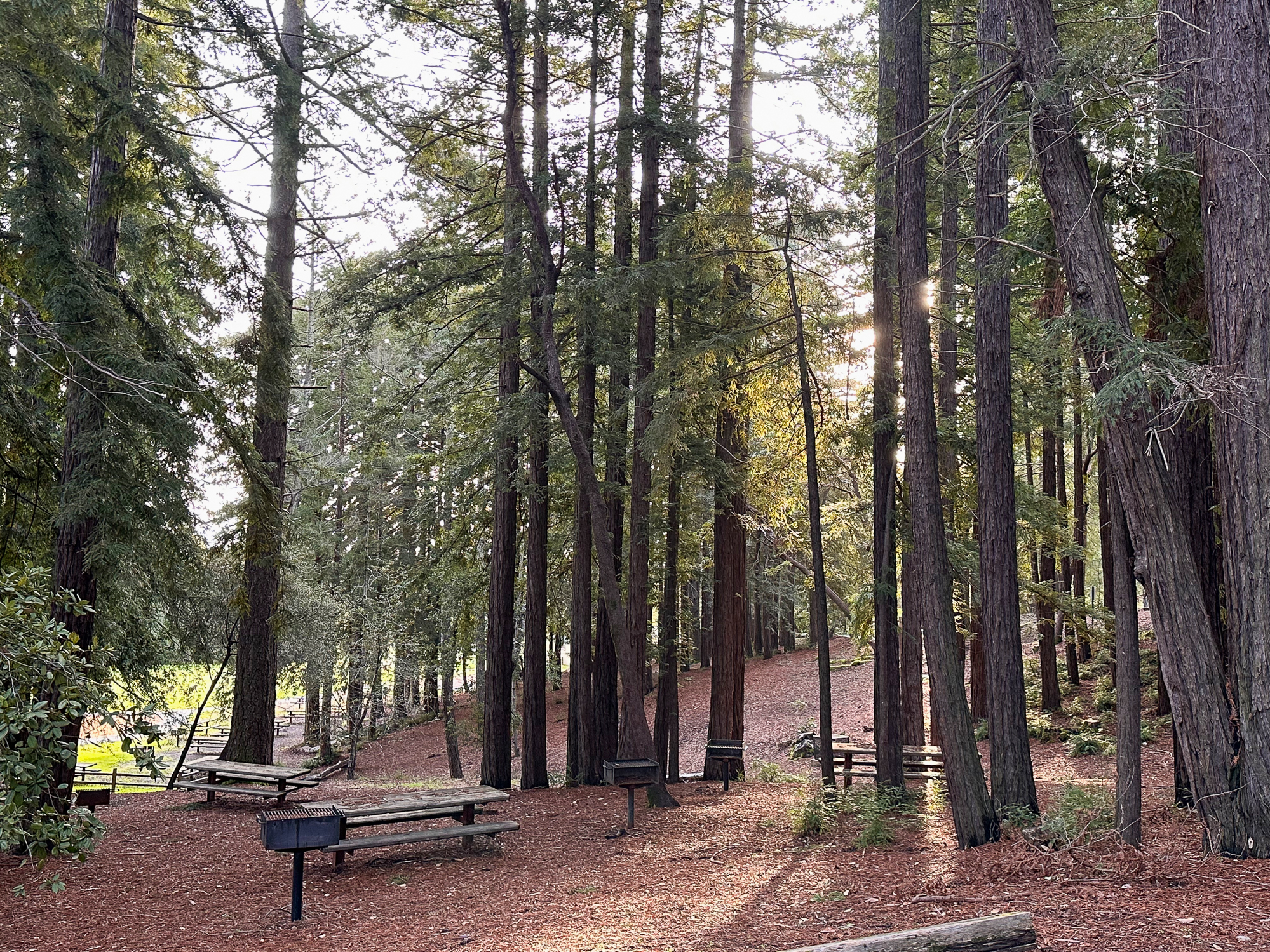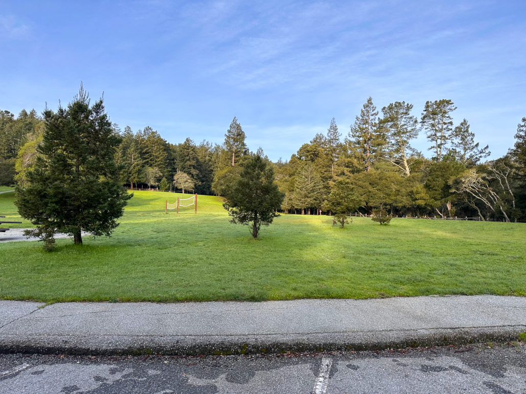 A wonderful feature of Huddart Park is a large, grassy meadow in the main parking area. Picnic sites and restrooms surround the meadow. This hike description begins on the western side of the meadow, near the Upper Werder Picnic Area, and follows the loop clockwise. This gets the busier part of the hike, next to the parking lots, out of the way, and then goes on to the quiet, more remote areas around the park’s northern side.
