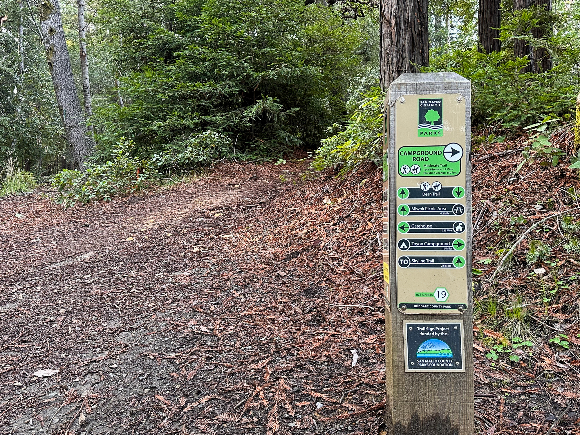 Begin your loop at Junction 19, near the Werder Picnic Shelter Area. Join the Dean Trail, heading south toward the Miwok Picnic Area. The single-track weaves close to parking areas in the first 0.3 miles, making it easy to pick up the trail from multiple places on the park’s western side. A great parking alternative is the Miwok Picnic Shelter, beside Junction 30, where the parking lot connects directly to the Dean Trail.