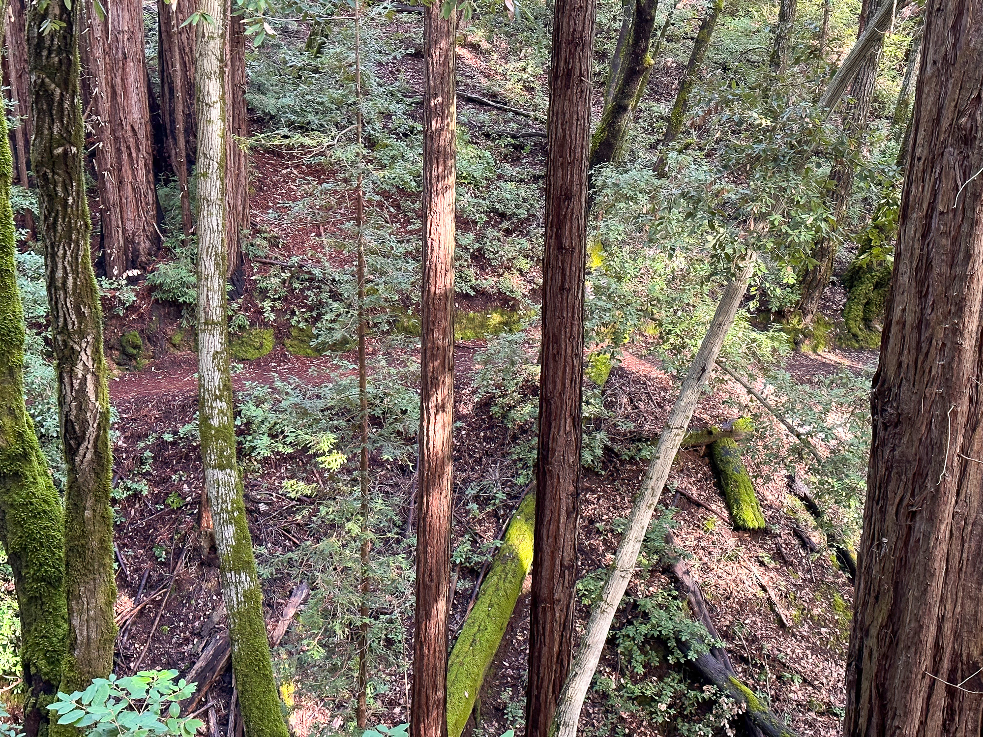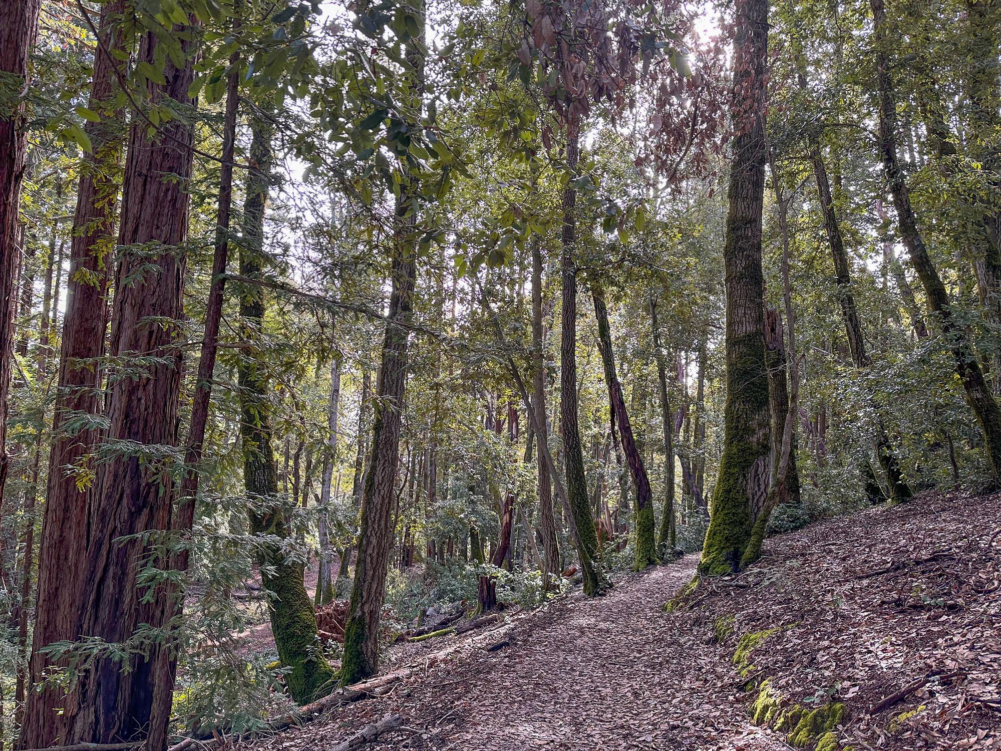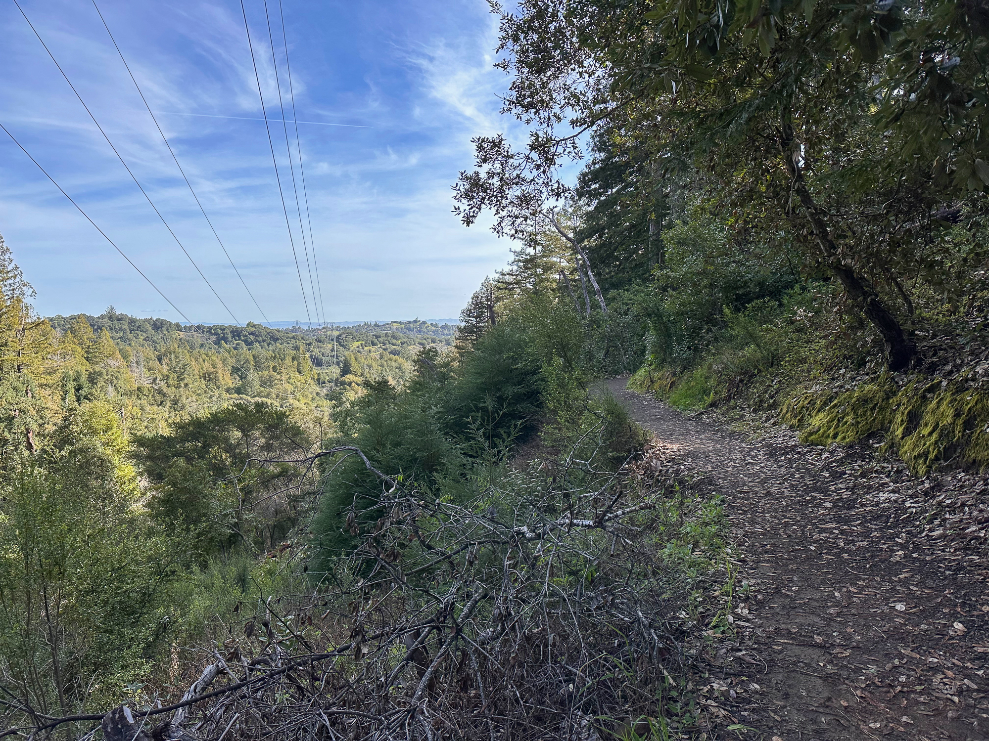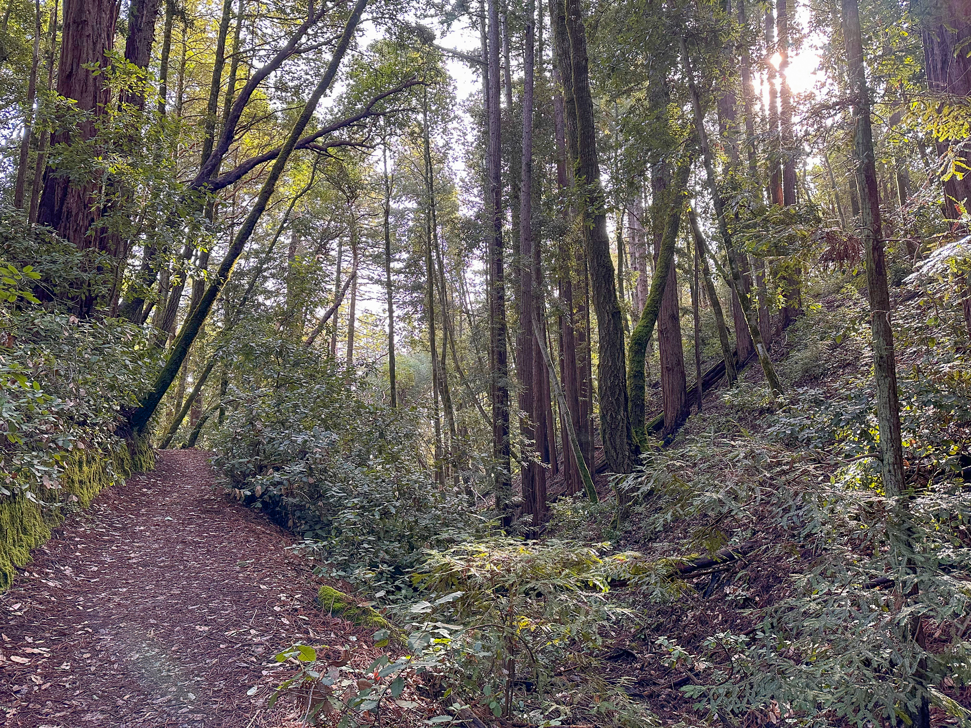 Descending eastward, the Crystal Springs Trail breaks into switchbacks, with oak and madrone mixed with redwood family circles. The canopy opens a bit more here, with light streaming down onto the trail. Breaks in the canopy provide views of Mount Diablo and the San Francisco Bay.