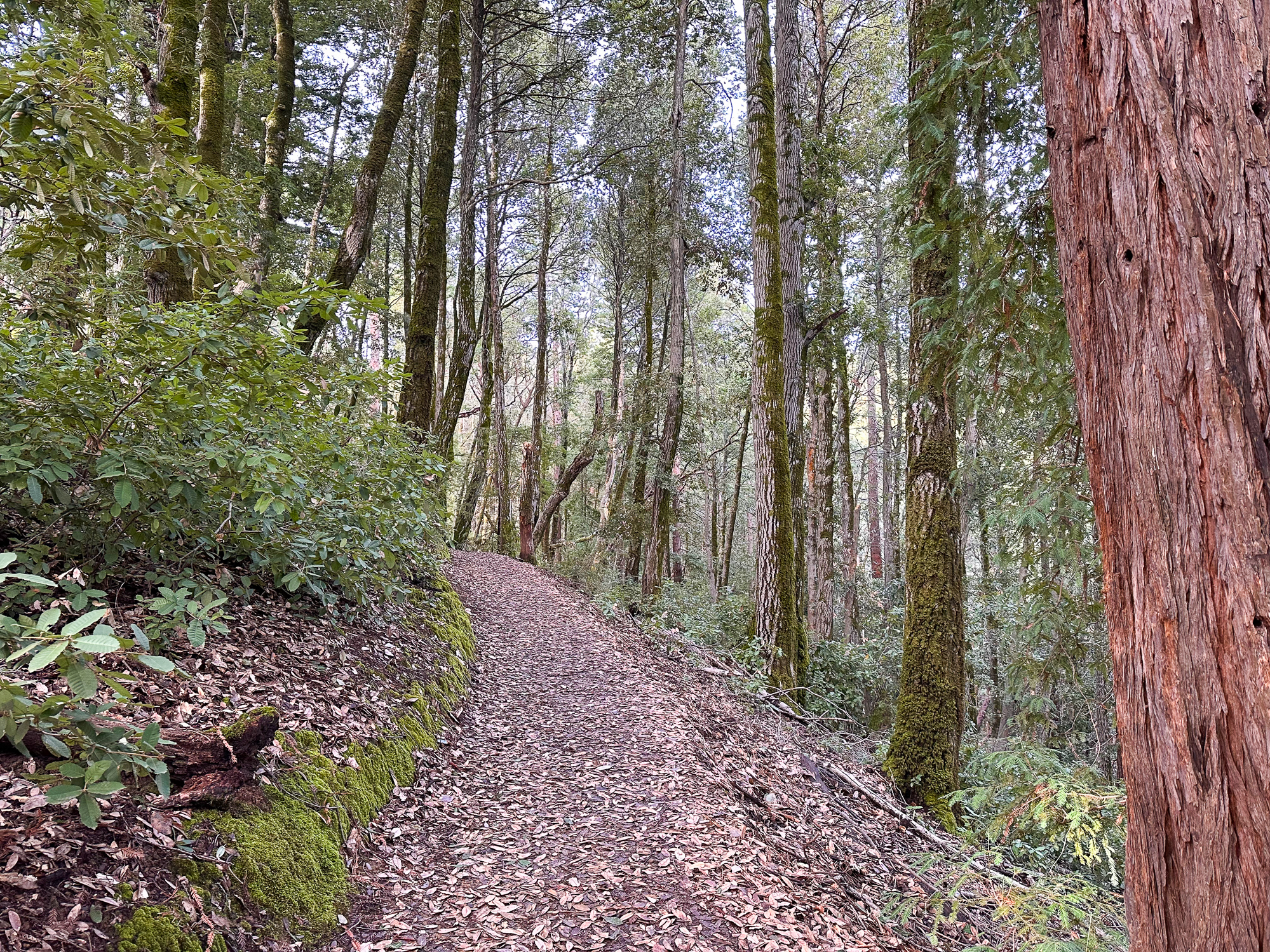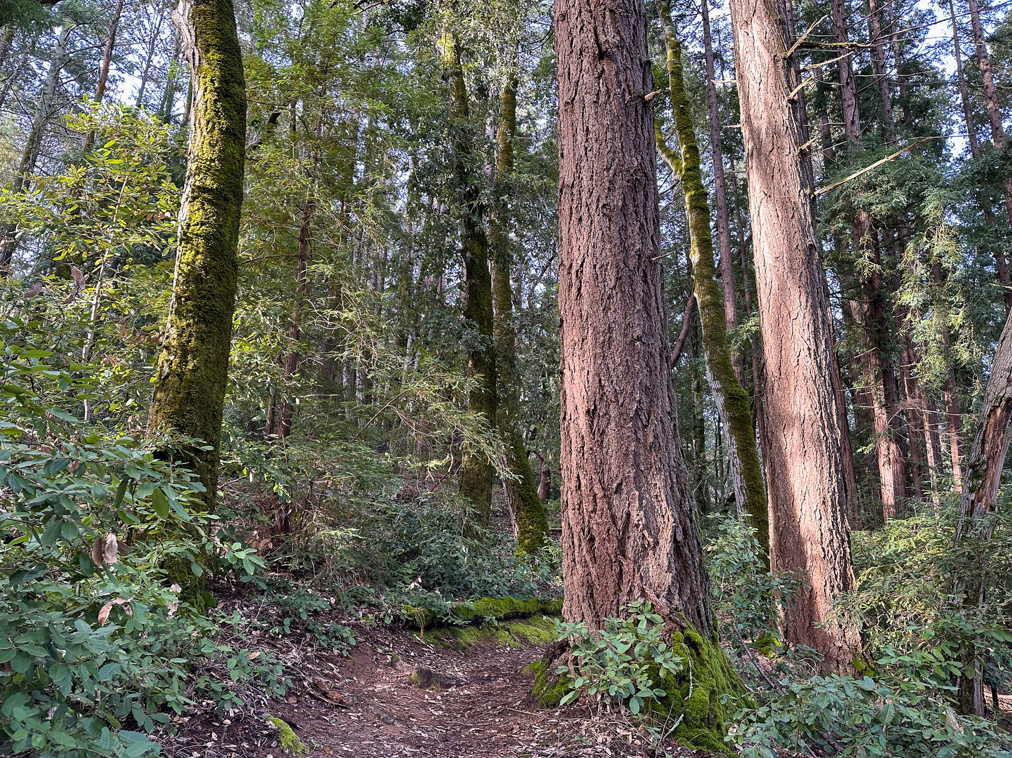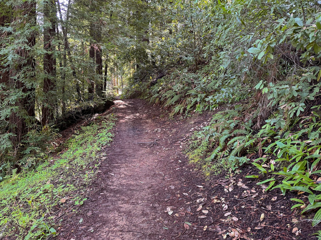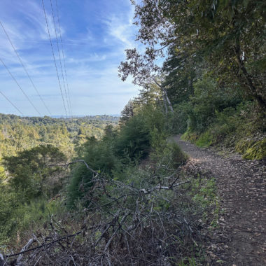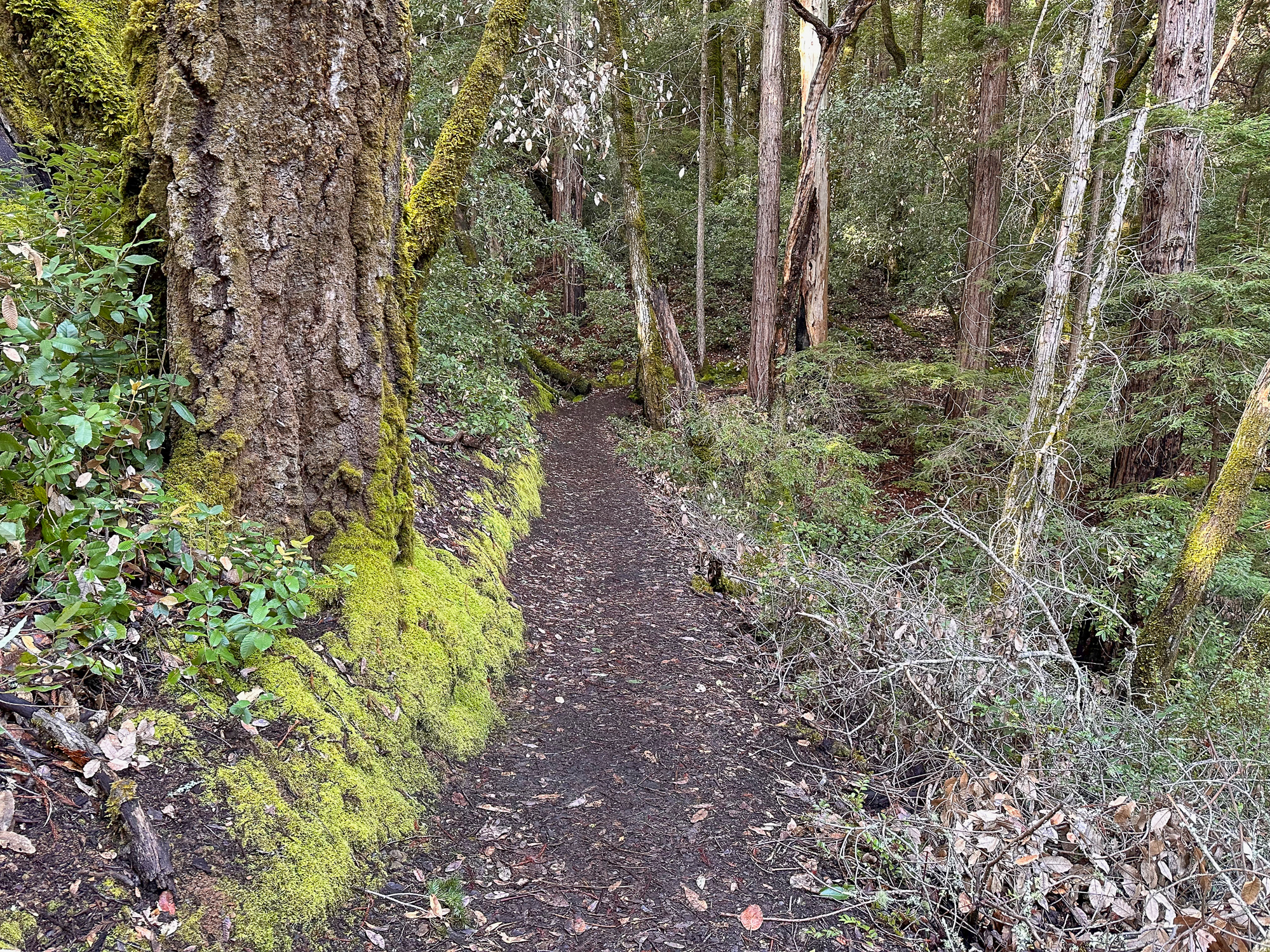 Descending eastward, the Crystal Springs Trail breaks into switchbacks, with oak and madrone mixed with redwood family circles. The canopy opens a bit more here, with light streaming down onto the trail. Breaks in the canopy provide views of Mount Diablo and the San Francisco Bay.