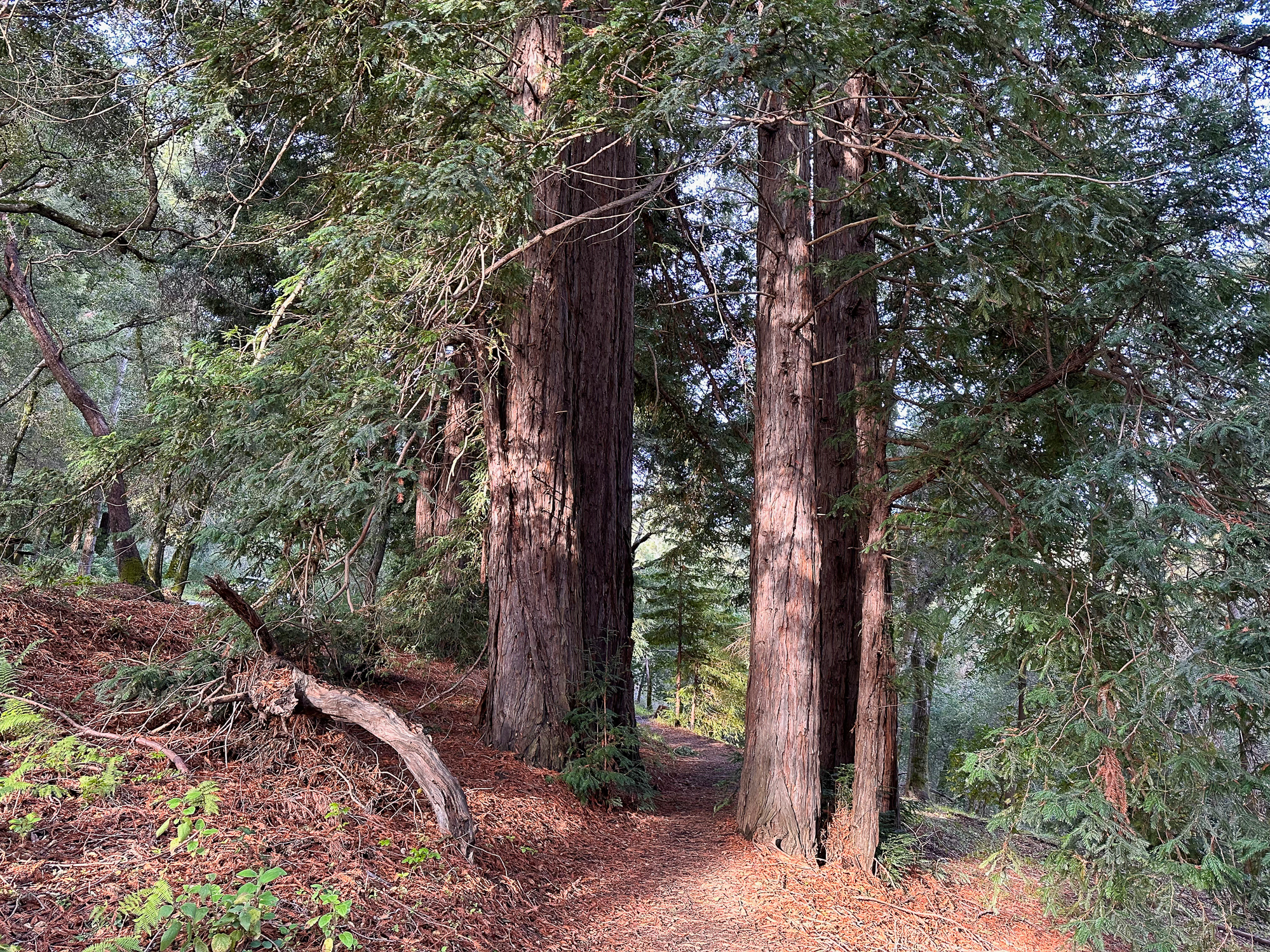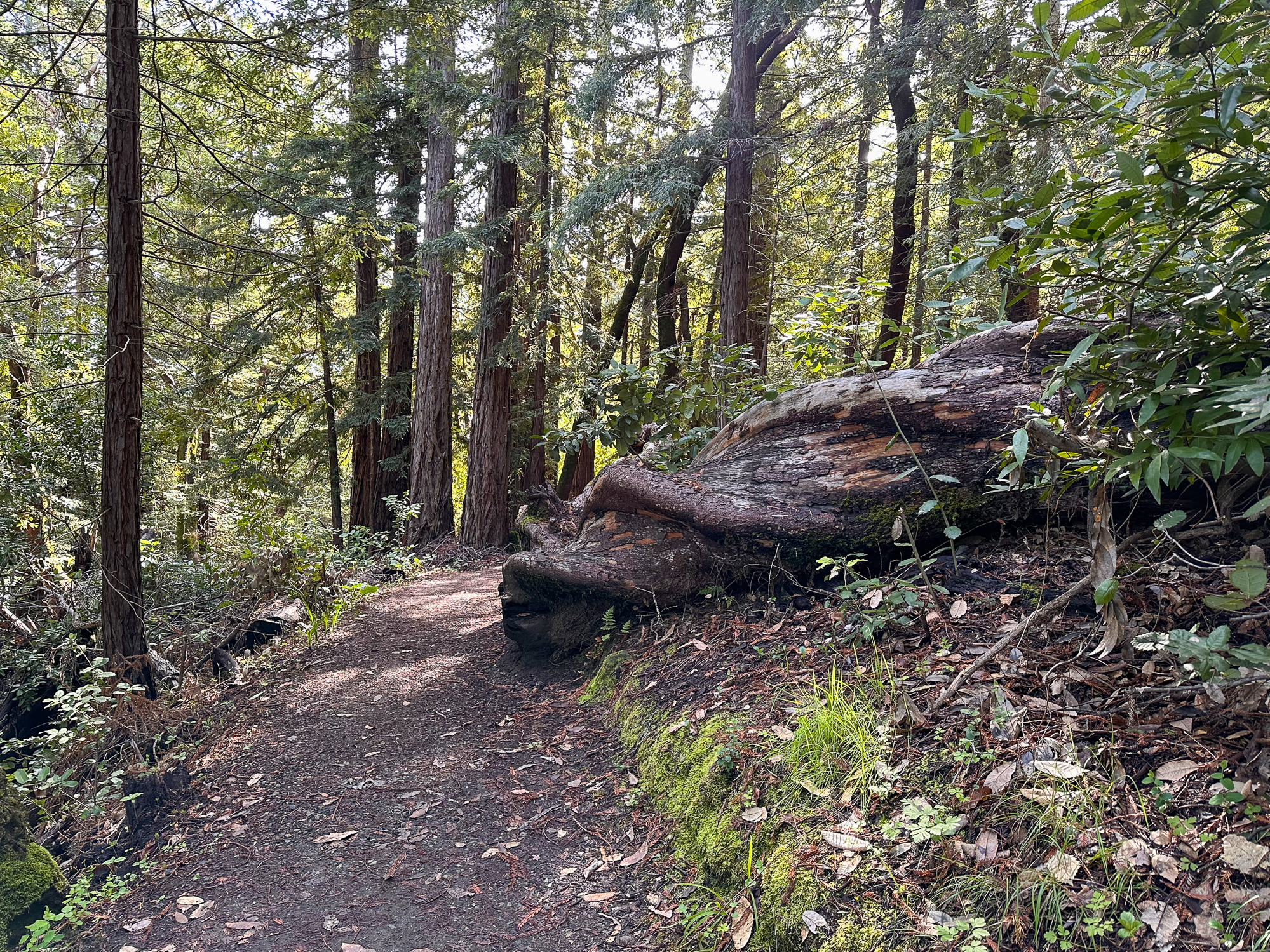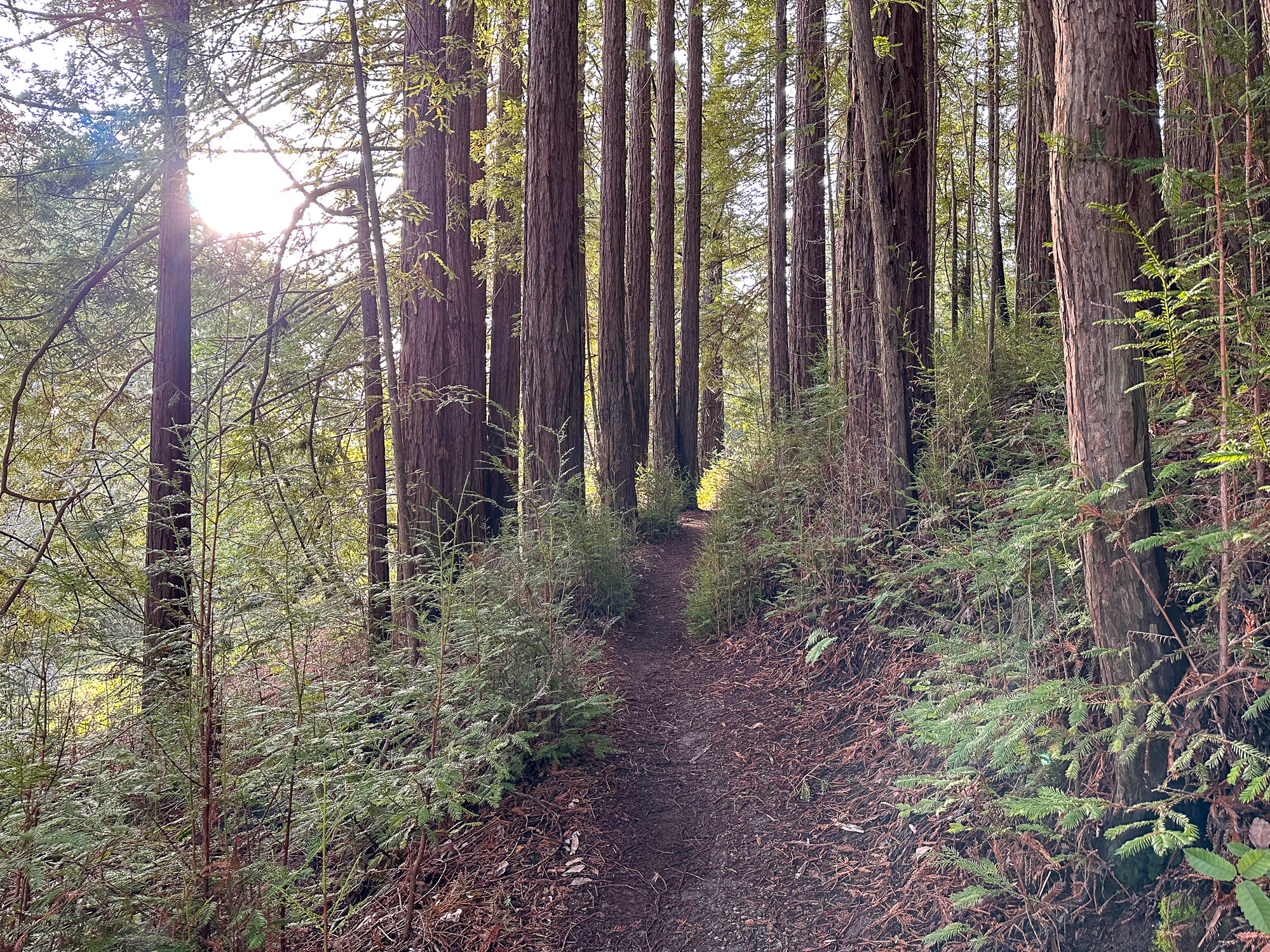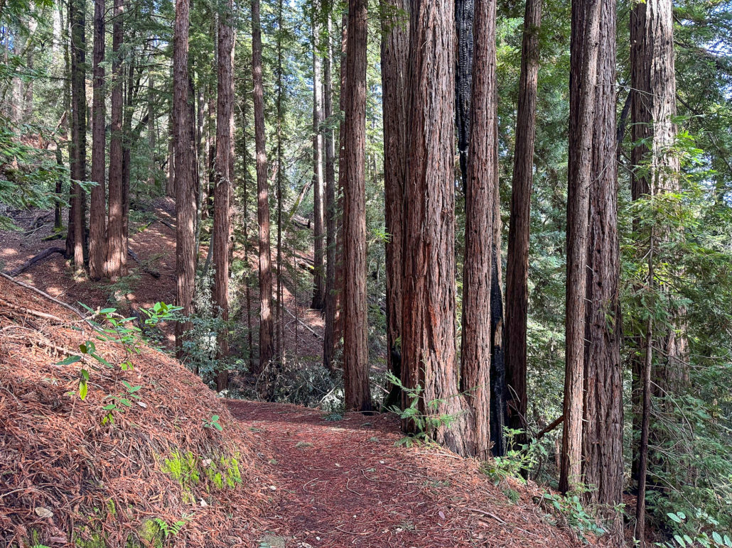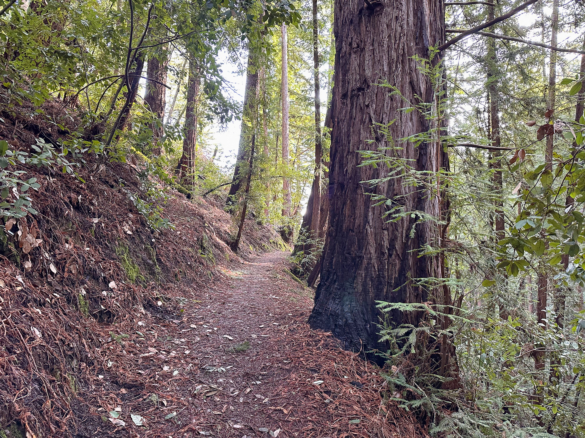 Descending eastward, the Crystal Springs Trail breaks into switchbacks, with oak and madrone mixed with redwood family circles. The canopy opens a bit more here, with light streaming down onto the trail. Breaks in the canopy provide views of Mount Diablo and the San Francisco Bay.