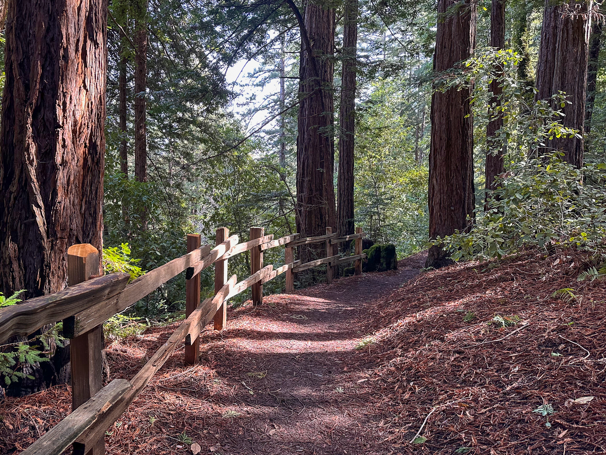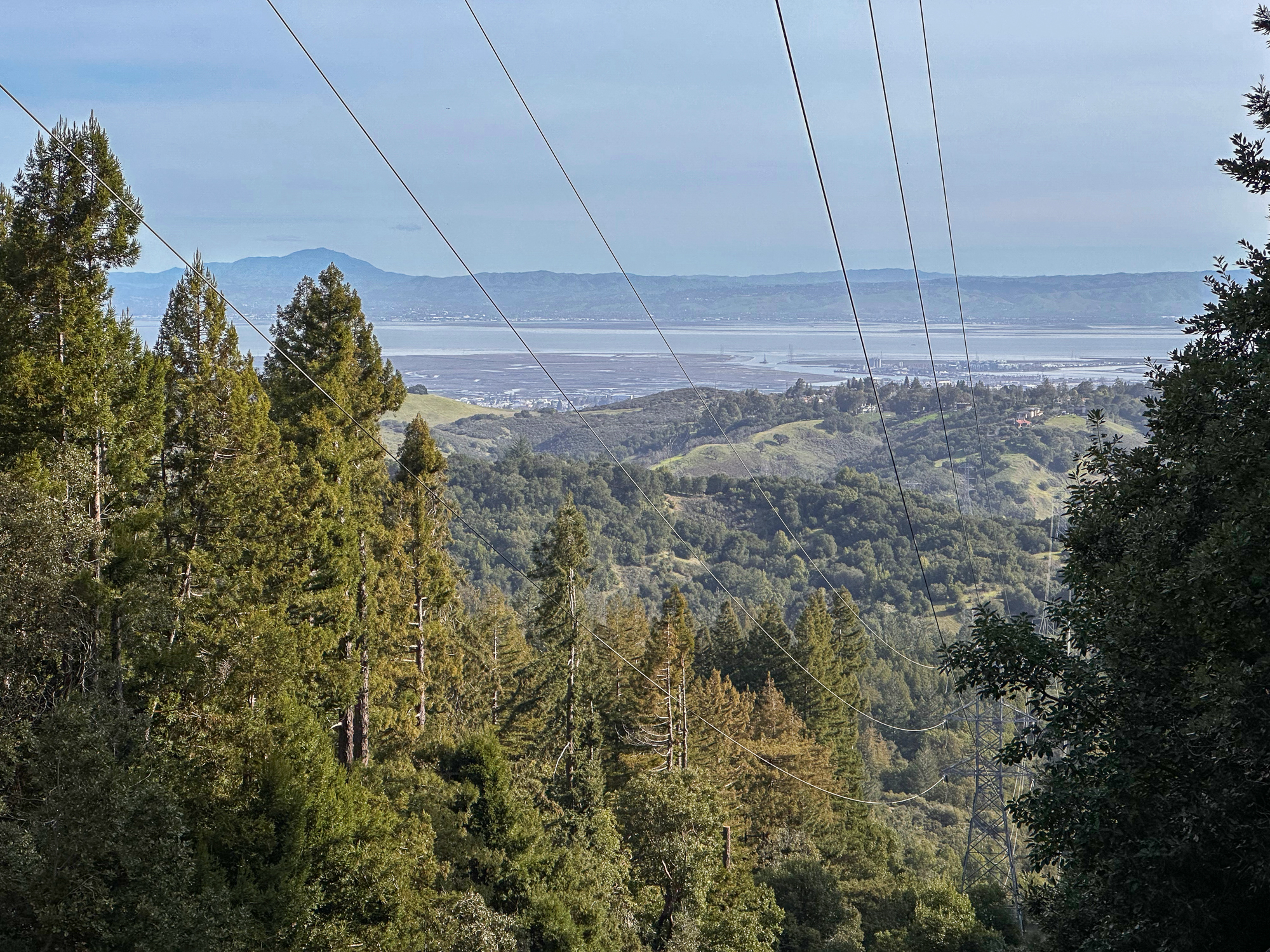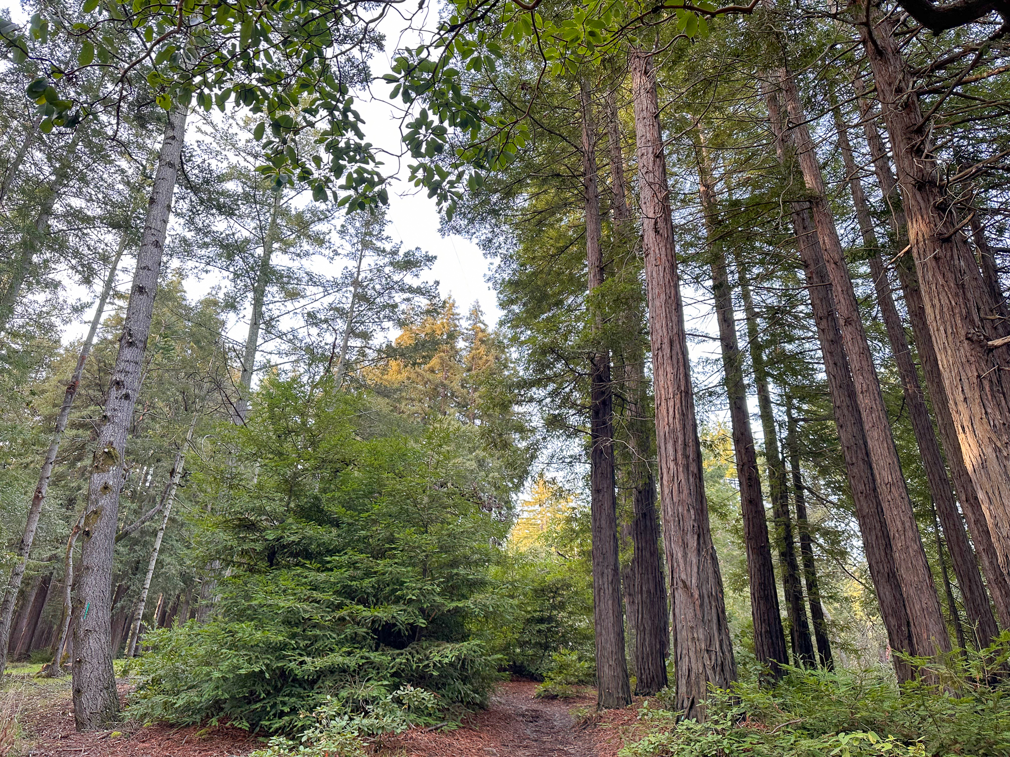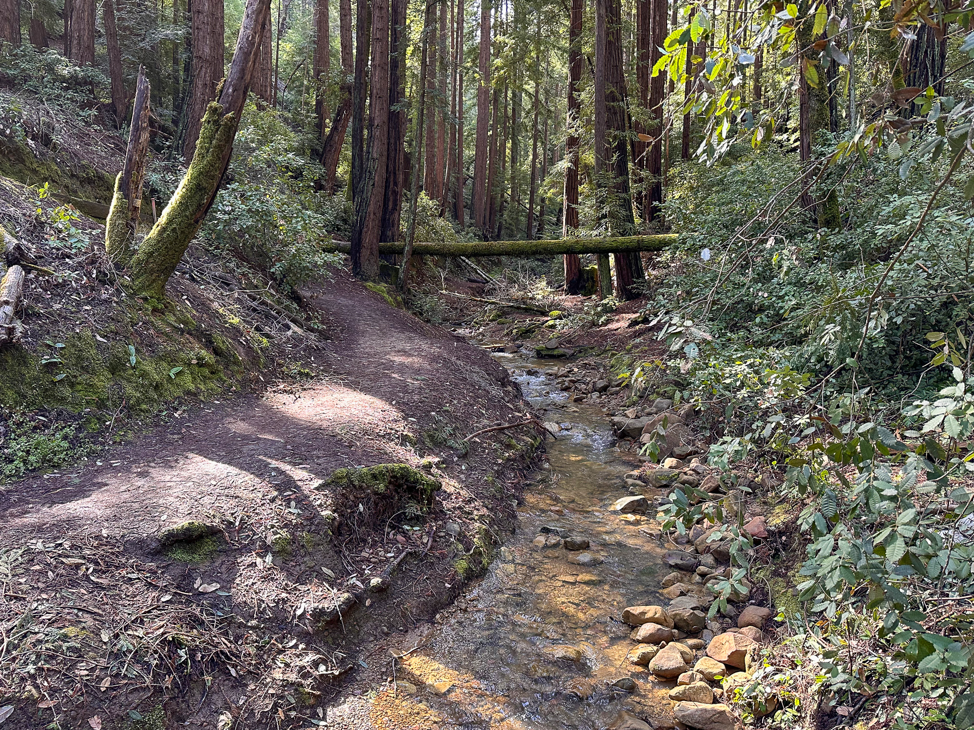Descending eastward, the Crystal Springs Trail breaks into switchbacks, with oak and madrone mixed with redwood family circles. The canopy opens a bit more here, with light streaming down onto the trail. Breaks in the canopy provide views of Mount Diablo and the San Francisco Bay.