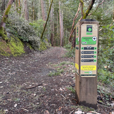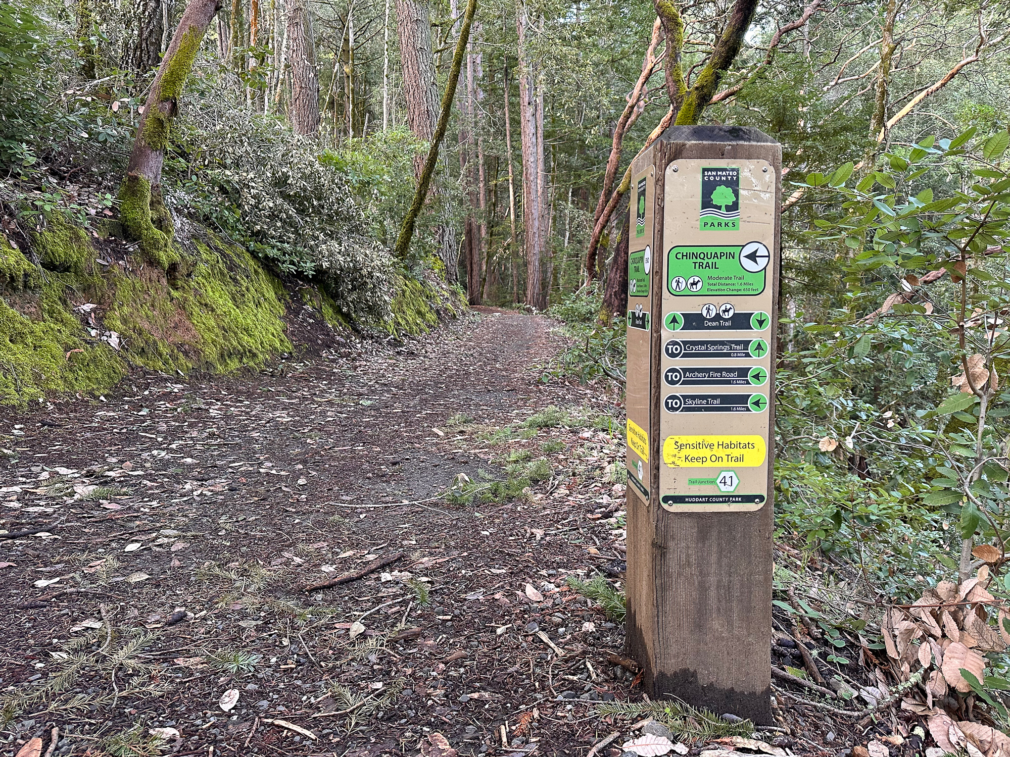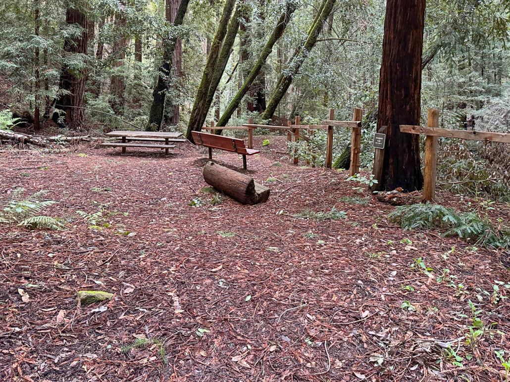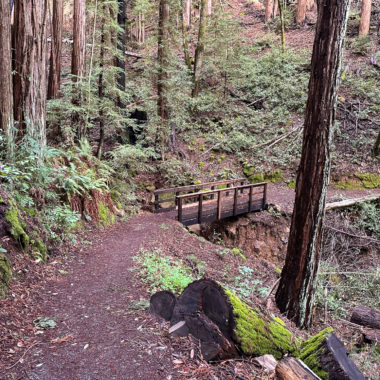 Just beyond the bridge, a spur trail leads to McGarvey Flat, a picnic area that makes a nice snack and stretch break. When ready, continue on the Dean Trail, heading north alongside curvy madrone and electric green moss. The park’s namesake, James Huddart, was a lumberman who deeded this land to become a public park. After he passed in 1935, it bounced from San Francisco to the state of California due to complications from water rights. It eventually became a San Mateo County park in the 1940s.