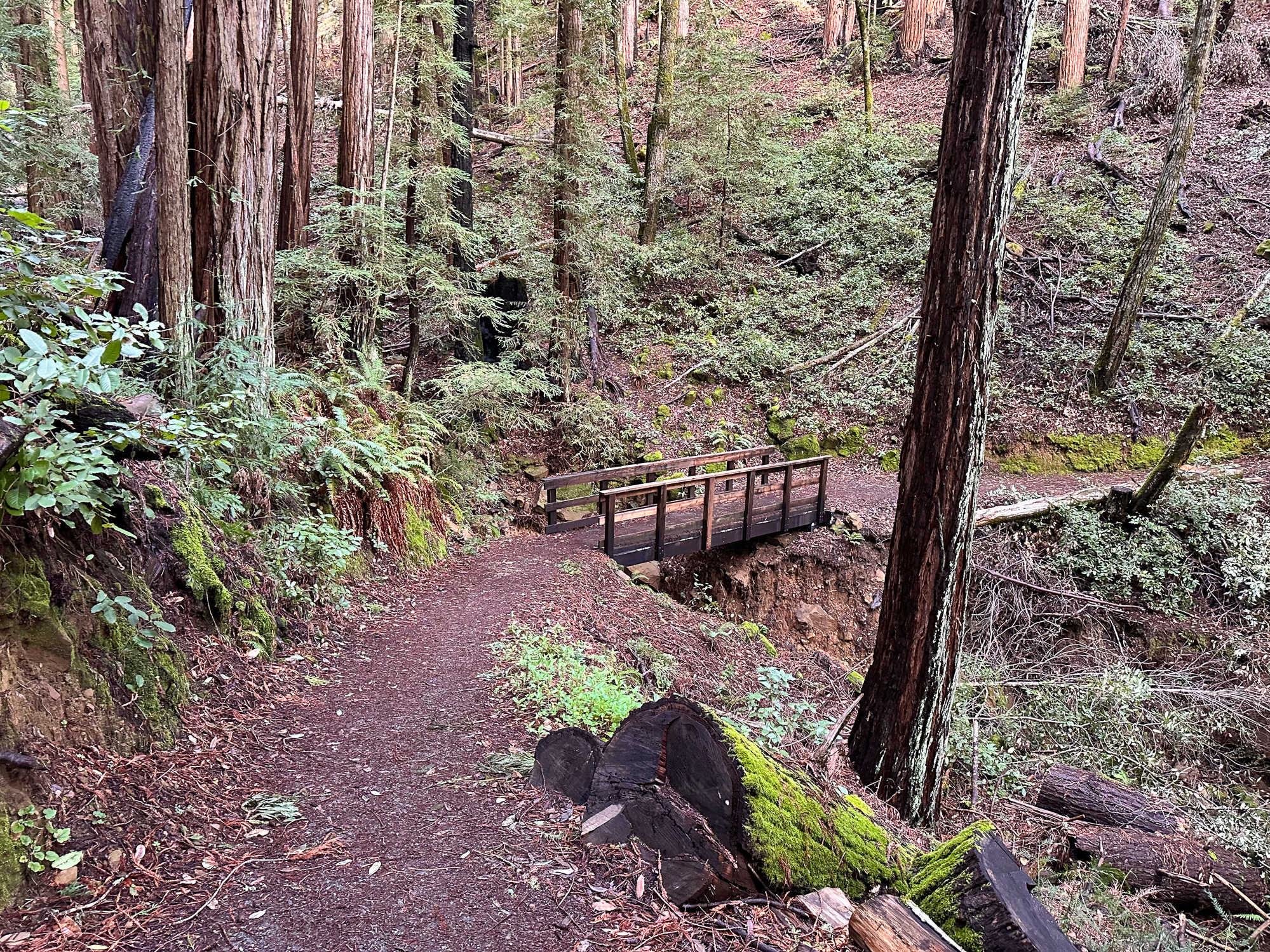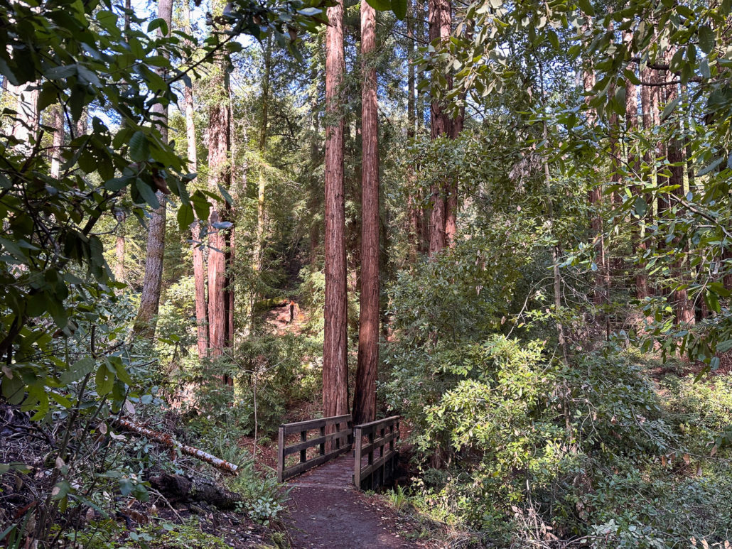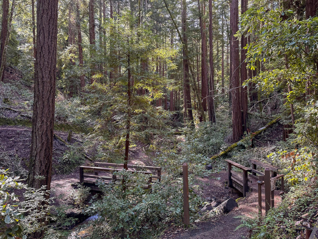 At 4.1 miles, follow a sharp switchback around Junction 14, staying on the Crystal Springs Trail. Up ahead are three wooden bridges over creeks. It is an especially picturesque spot, surrounded by Douglas fir and redwoods.