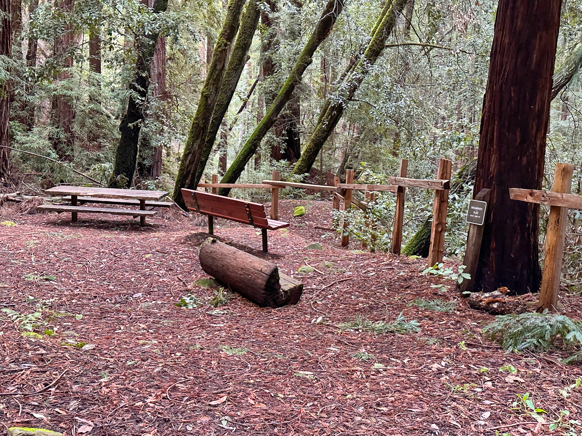 At the 1.0-mile mark, continue west on the Dean Trail. Entering McGarvey Gulch, the trailside seemingly drops away, rolling steeply downhill to McGarvey Gulch Creek. Tall redwoods grow in the cool, shady, and damp gulch.