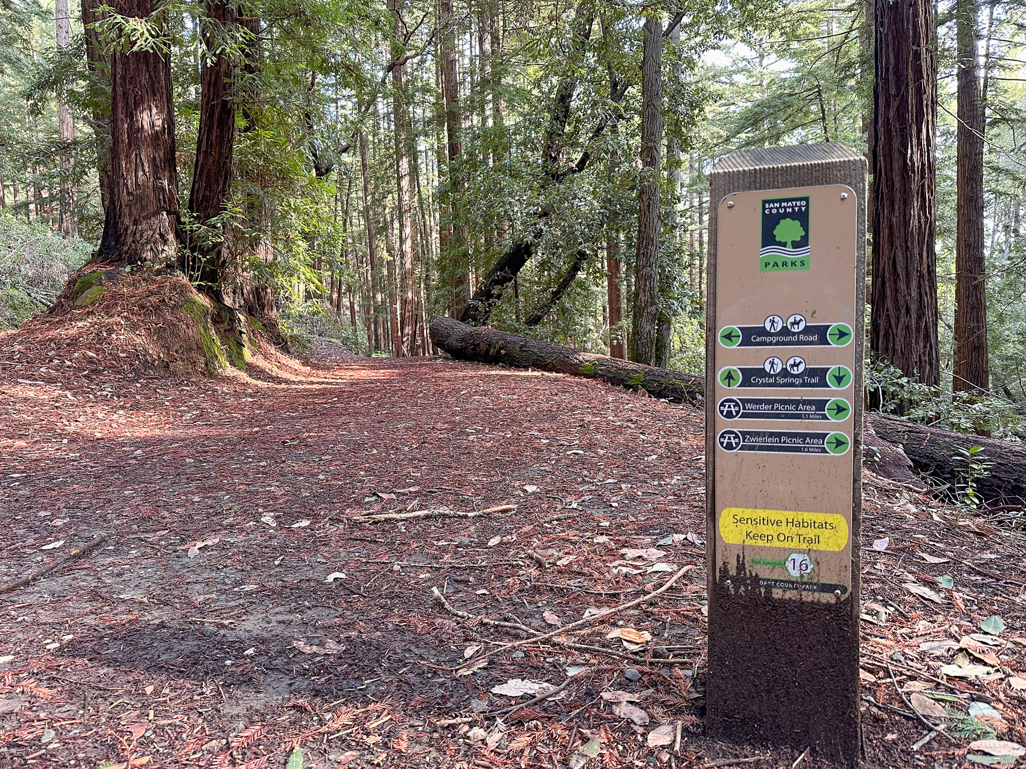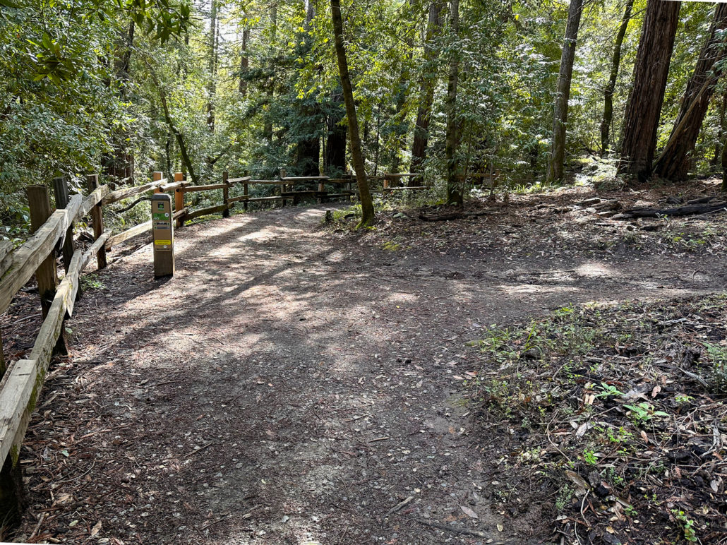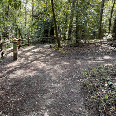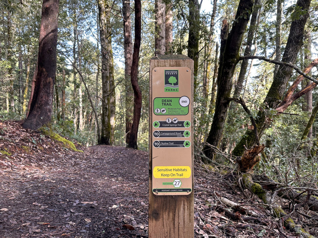 At the 2.0-mile mark, reach the end of the Dean Trail at Junction 27. Stay straight and merge onto the Crystal Springs Trail toward Campground Road. This is the highest point of the hike and from here it trends downhill. Next up, you have the pleasure of another gulch, albeit a small one, with second-growth redwoods.