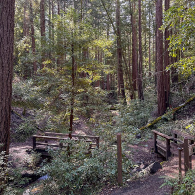 Cross a bridge over McGarvey Gulch Creek, a seasonal creek in the San Francisquito Watershed. The creek’s surroundings are full of green ferns, shrubs, and redwoods. Downstream, the creek provides habitat for steelhead trout. After a rainy winter, the creek flows well but can dry out in warmer months.