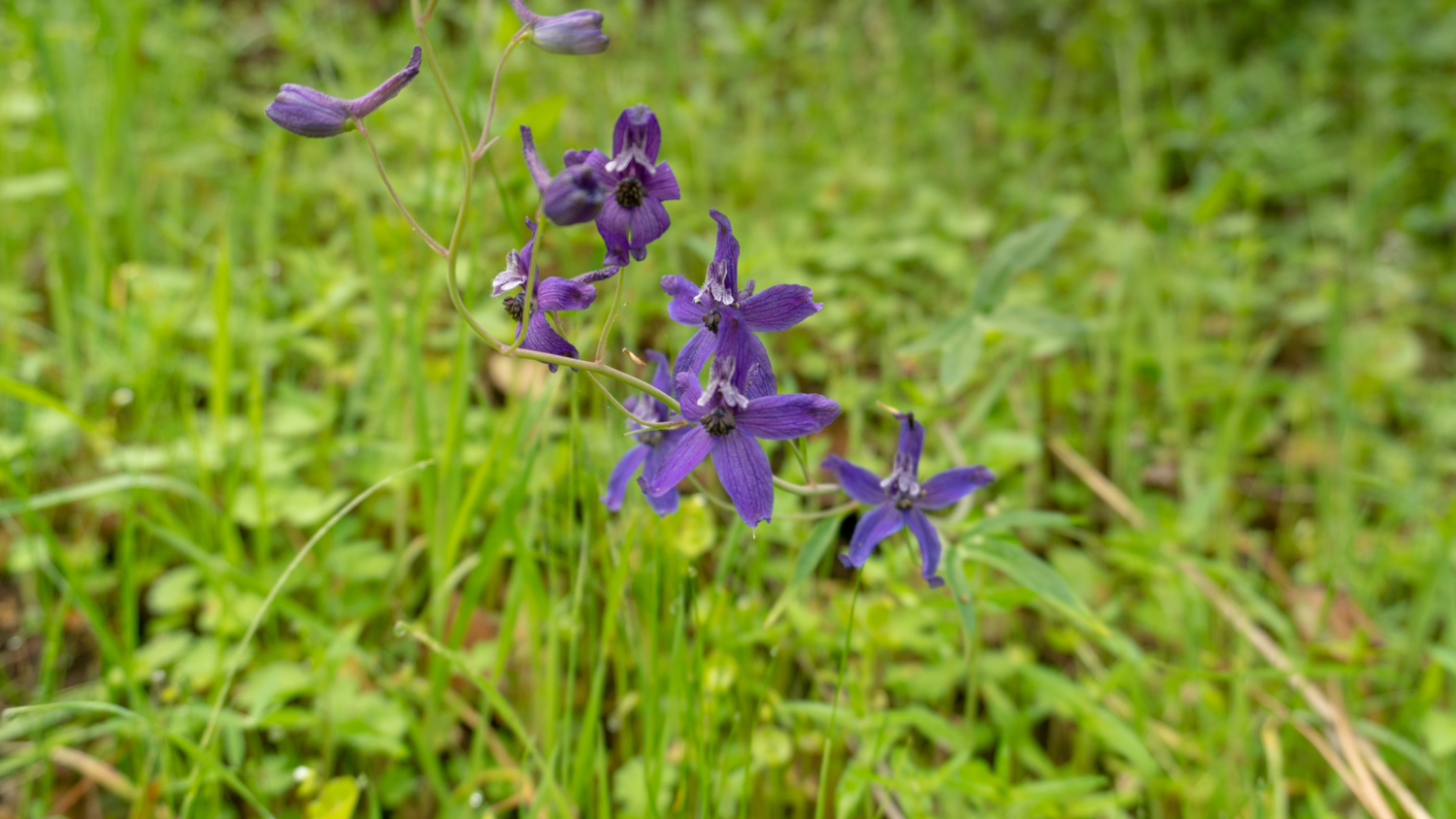 Hike north along the ridge past Eagle Peak, staying straight onto the Mitchell Rock Trail at 6.4 miles. Pass Twin Peaks and Mitchell Rock on a sharp and rubbly descent, after which the trail transitions into packed down dirt. This section of gorgeous single-track switchbacks through grasslands of blue dicks, warrior’s plume, spreading larkspur, and the occasional checker lily.