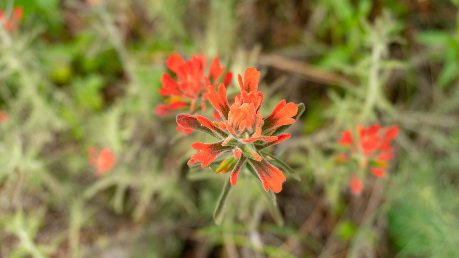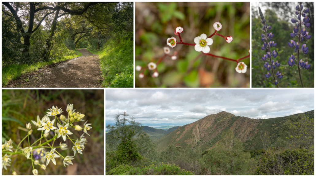 After rejoining Mitchell Canyon Road at 1.2 miles, the trail stays at a gentle incline beside Mitchell Creek. In a little over a mile, the steep climb out of Mitchell Canyon begins, gaining 1,000 feet over the next 1.5 miles to Deer Flat. Lupine, Fremont’s star lily, and California saxifrage peek out from the chaparral, along with Eagle Peak to the northeast.