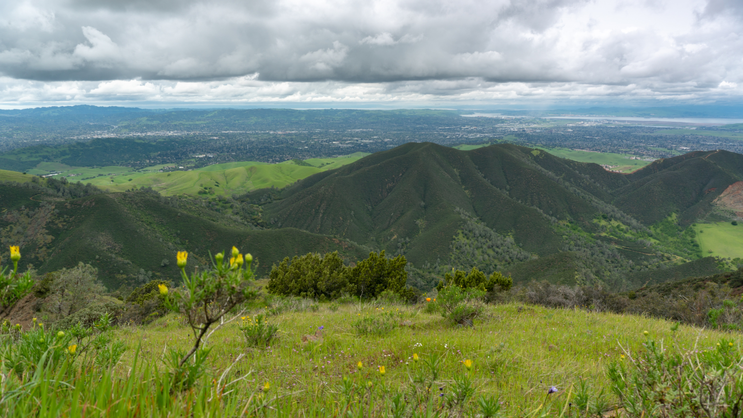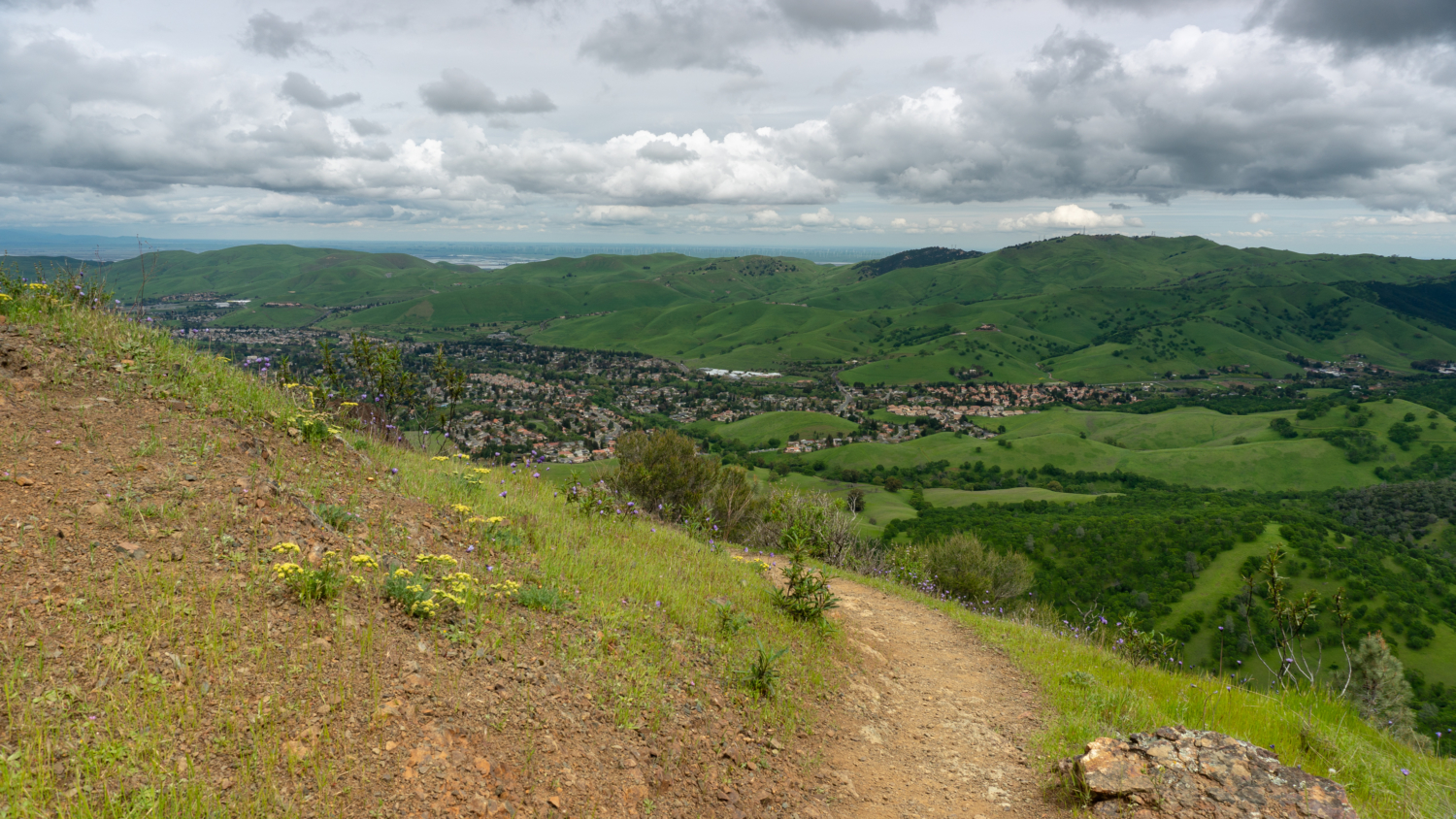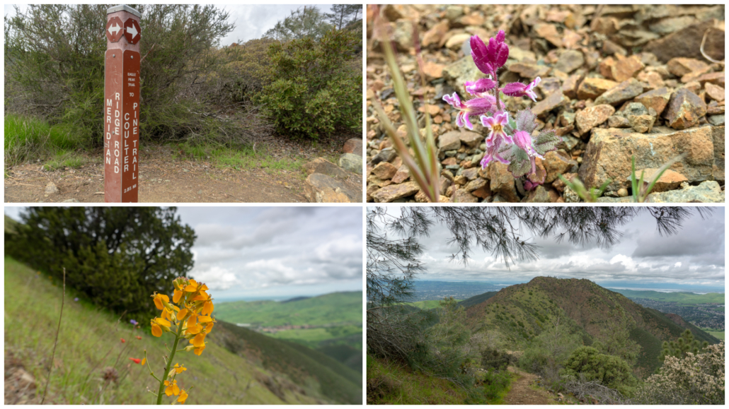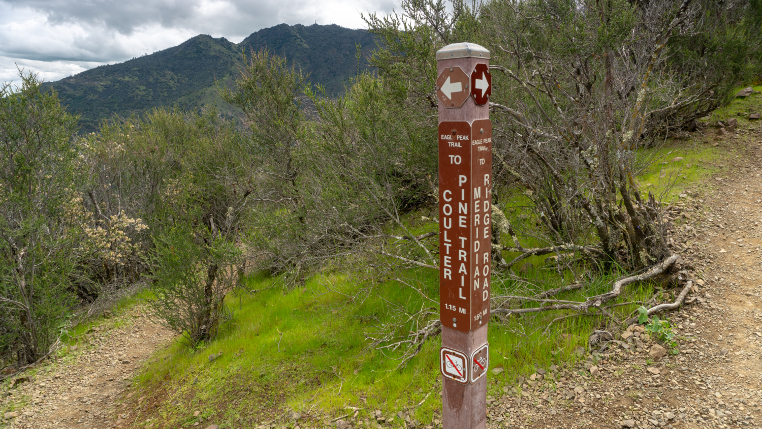 Turn left onto the Eagle Peak Trail, heading north towards Eagle Peak. The single-track trail is dry and rocky as you climb a small ridge, and then in true Mount Diablo style, it drops over 250 feet before regaining it to the peak. No matter, the ridgeline views are some the best in the park: waves of green foothills rolling down the ridge, pine-framed views of Eagle Peak, and, in spring, the rare Mount Diablo jewel flower blooming among the rocks.