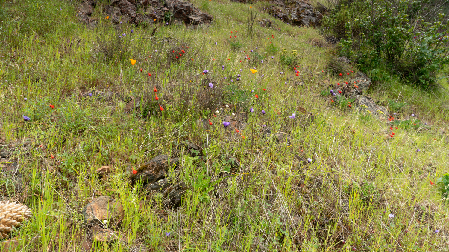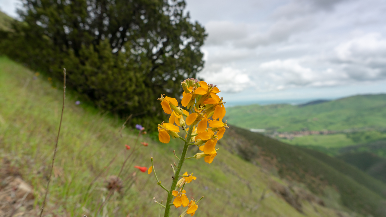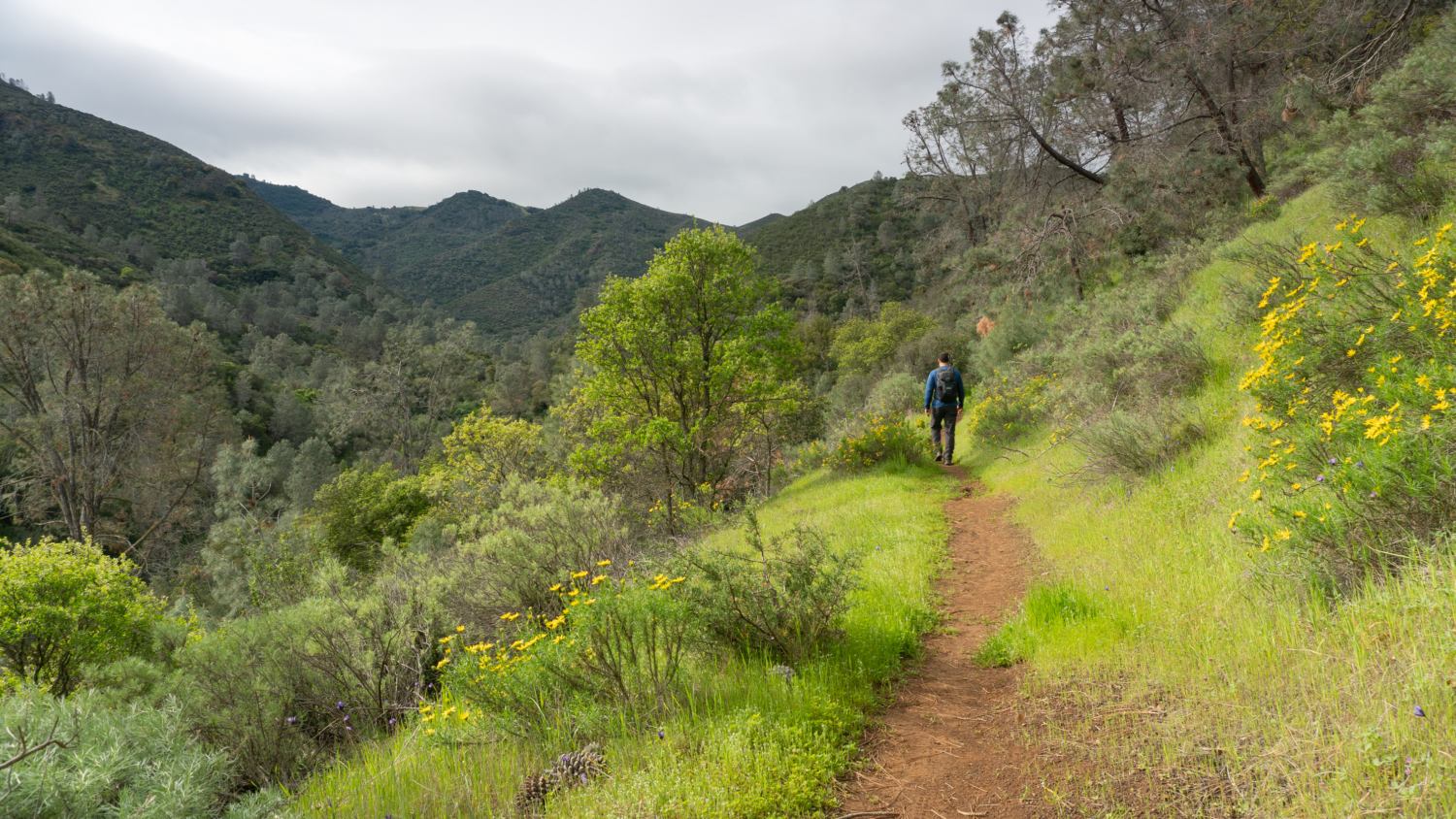 Turn left onto the Eagle Peak Trail, heading north towards Eagle Peak. The single-track trail is dry and rocky as you climb a small ridge, and then in true Mount Diablo style, it drops over 250 feet before regaining it to the peak. No matter, the ridgeline views are some the best in the park: waves of green foothills rolling down the ridge, pine-framed views of Eagle Peak, and, in spring, the rare Mount Diablo jewel flower blooming among the rocks.