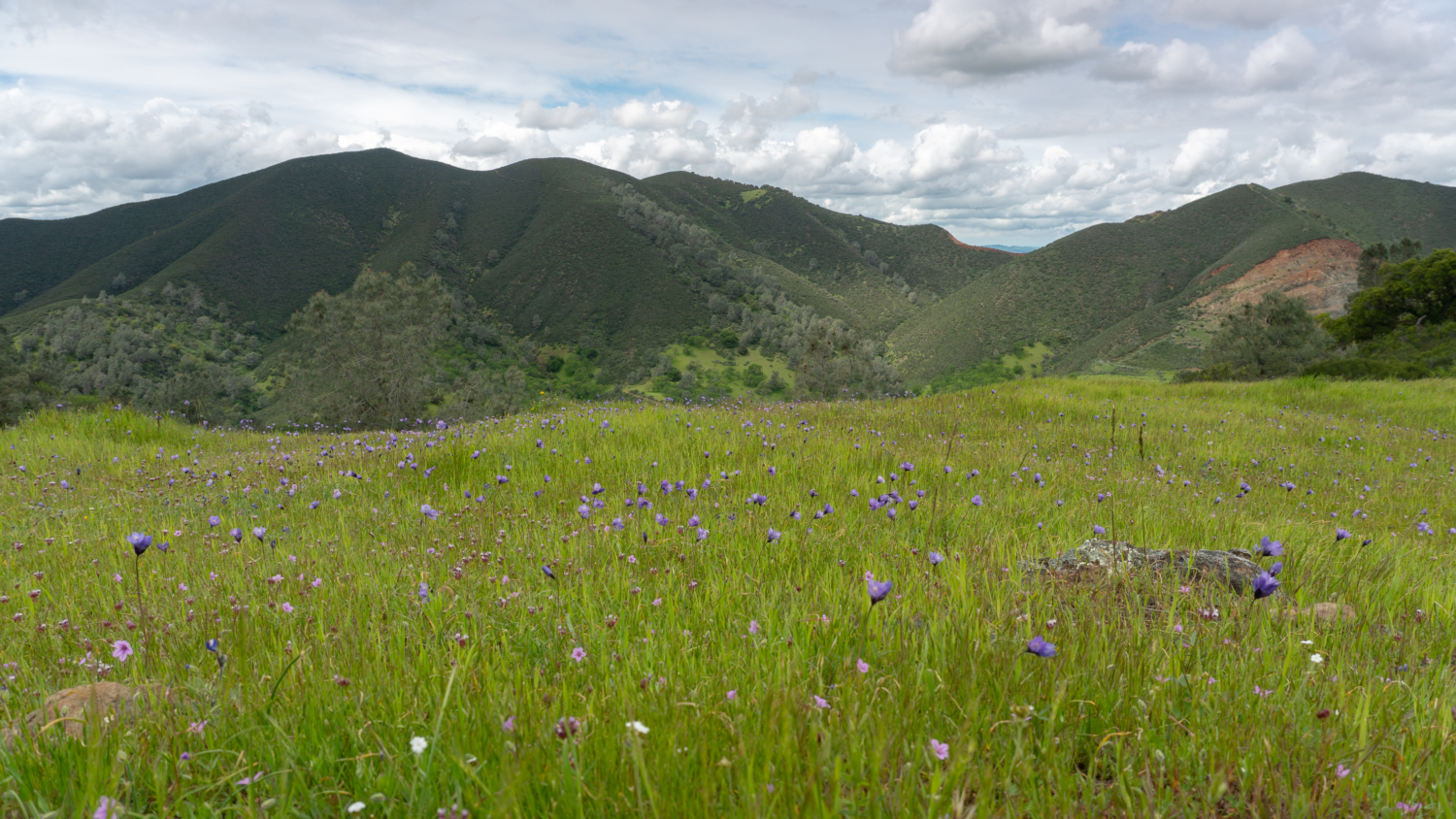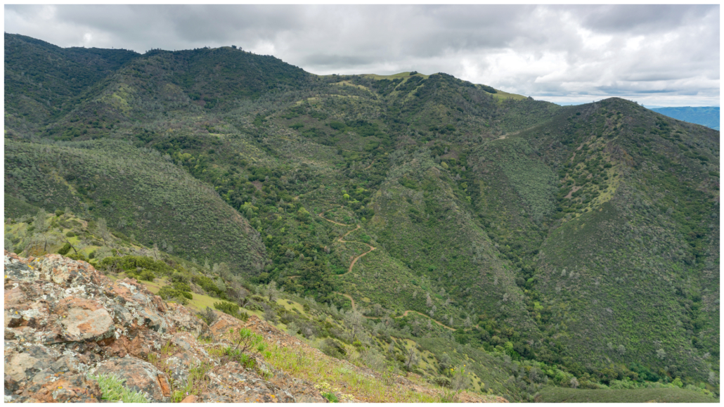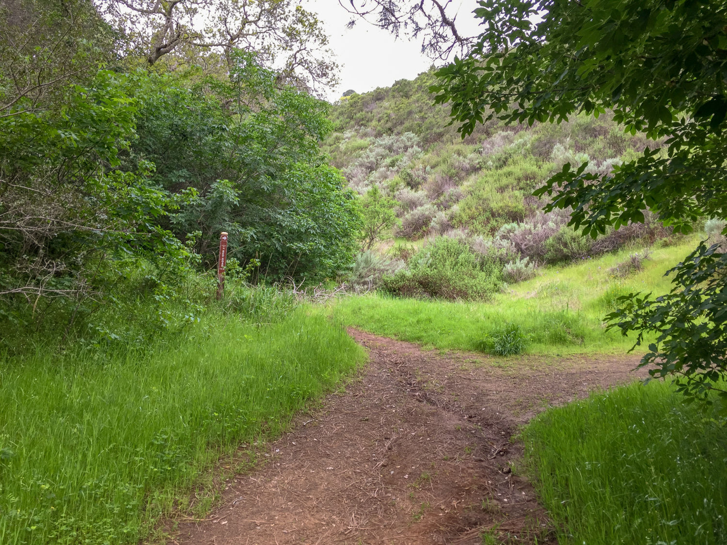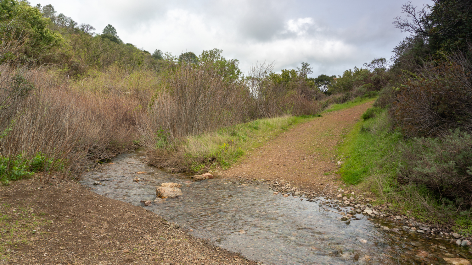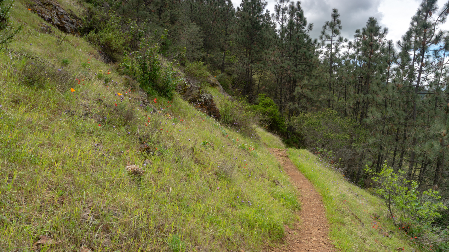 Reach Deer Flat at 3.9 miles. Just beyond it, turn left at a Y-junction onto Meridian Ridge Road towards Murchio Gap. A smattering of baby blue eyes brightens the trail in spring, and as you descend, you have a gorgeous vista of Bald Ridge rising above the trail. Descend 130 feet to a stone crossing over Deer Flat Creek, regaining the elevation to reach Murchio Gap at 4.7 miles and 2330 feet. Whew! Although you still have a few hundred feet to climb, the majority of the steep, fire-road climbing is finished.