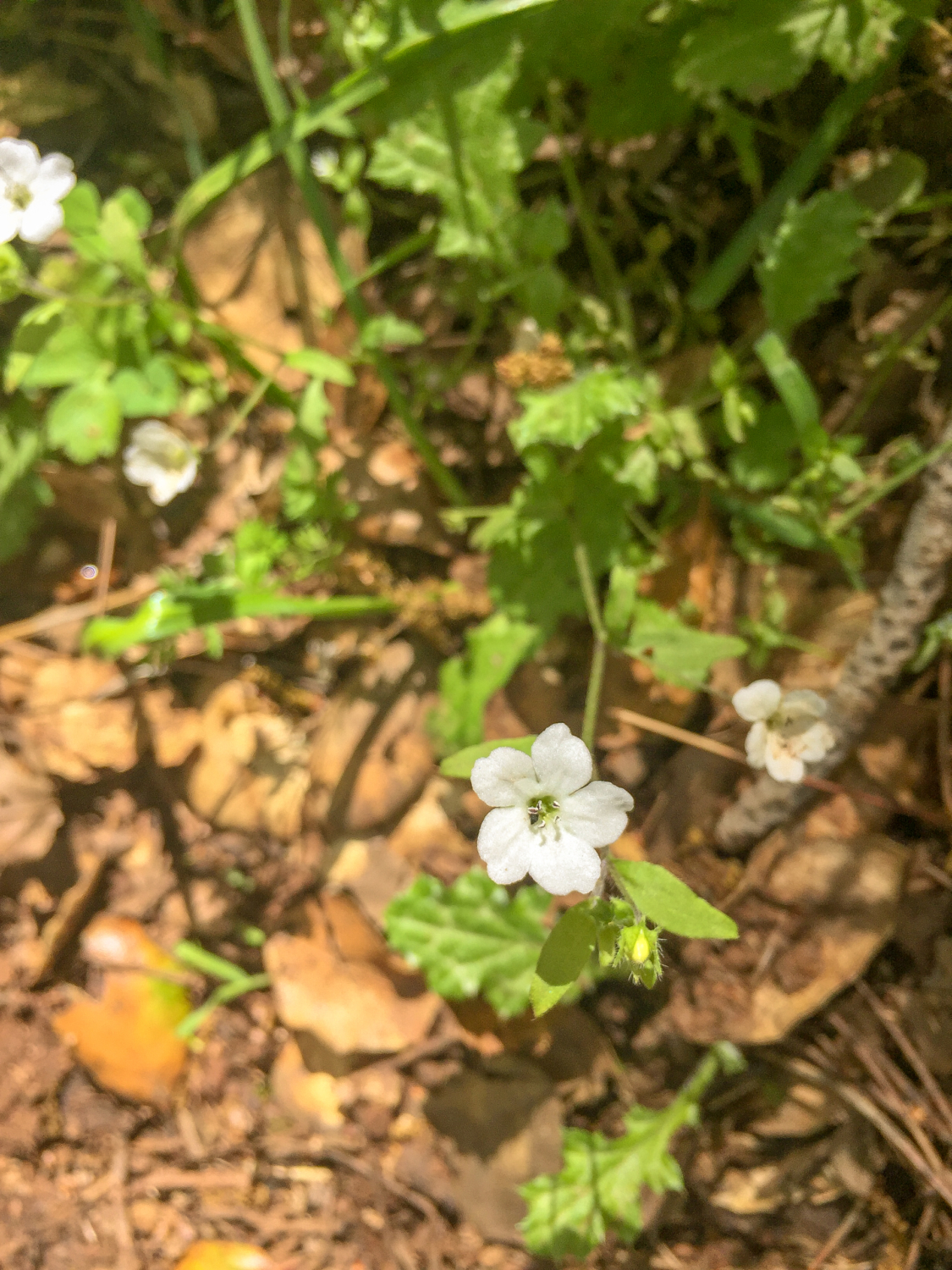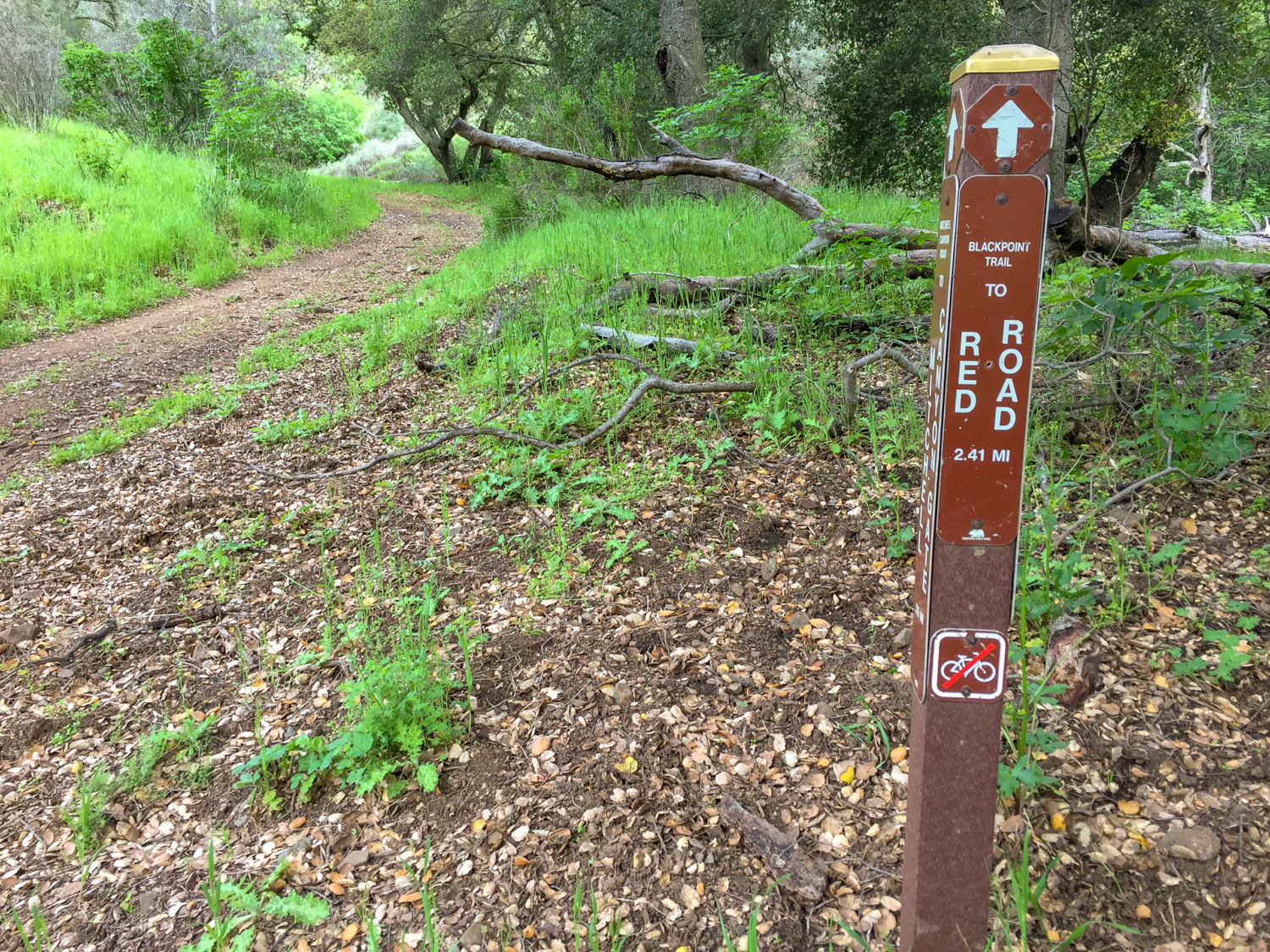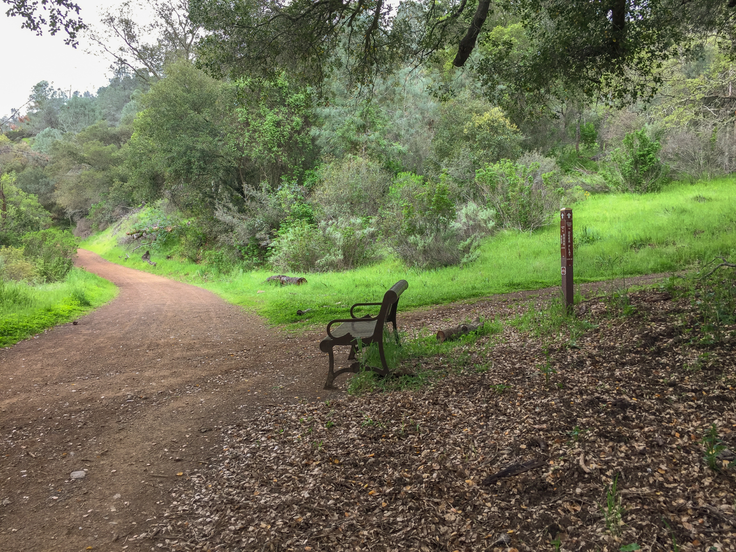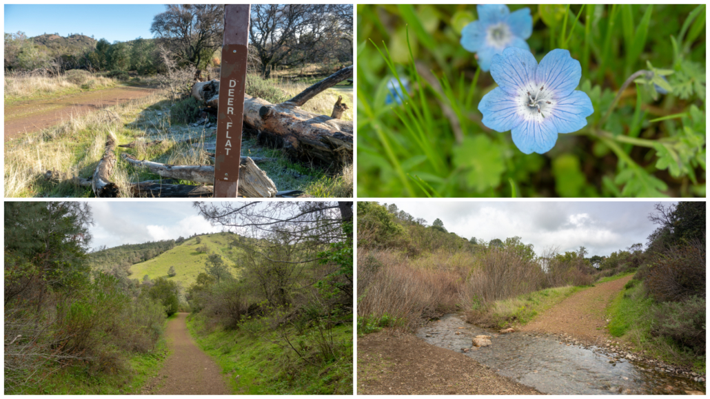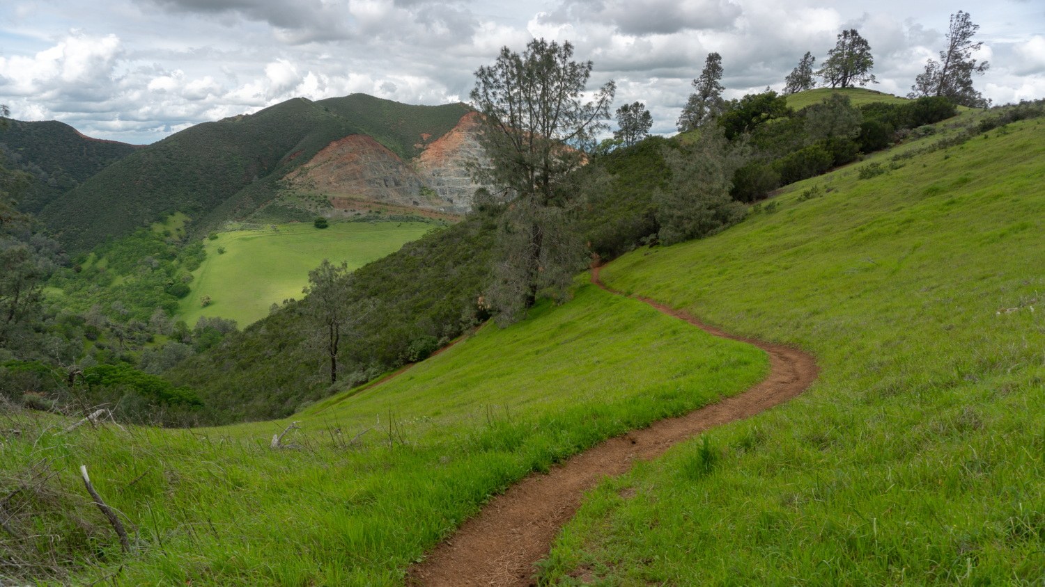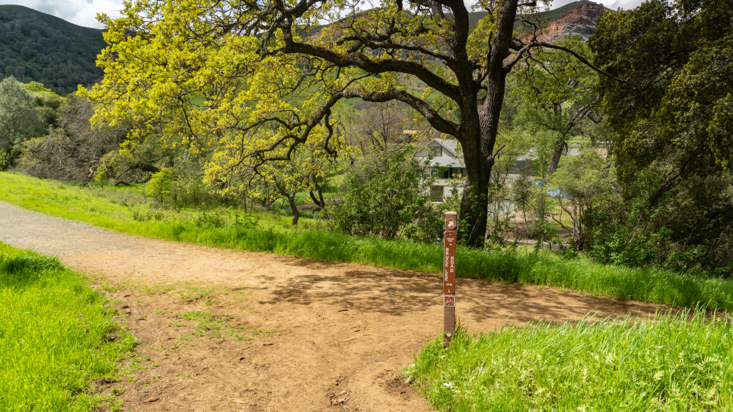 Reach Deer Flat at 3.9 miles. Just beyond it, turn left at a Y-junction onto Meridian Ridge Road towards Murchio Gap. A smattering of baby blue eyes brightens the trail in spring, and as you descend, you have a gorgeous vista of Bald Ridge rising above the trail. Descend 130 feet to a stone crossing over Deer Flat Creek, regaining the elevation to reach Murchio Gap at 4.7 miles and 2330 feet. Whew! Although you still have a few hundred feet to climb, the majority of the steep, fire-road climbing is finished.
