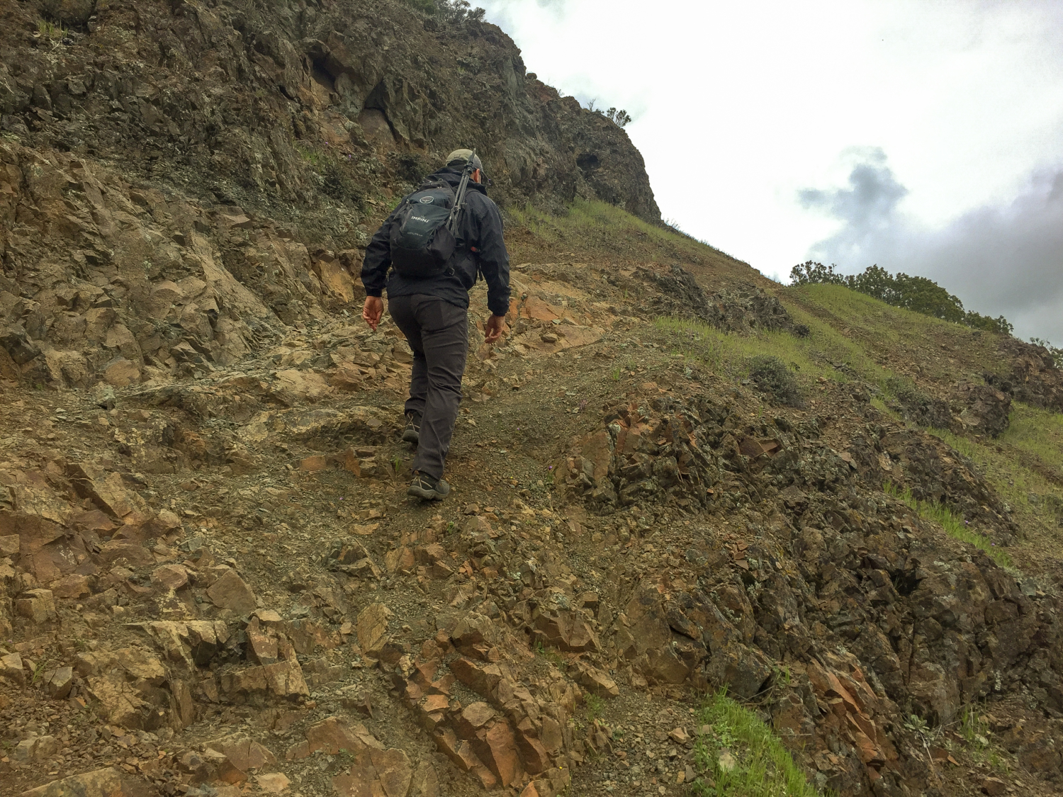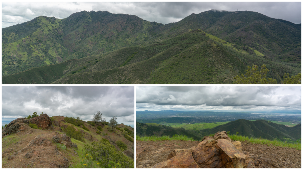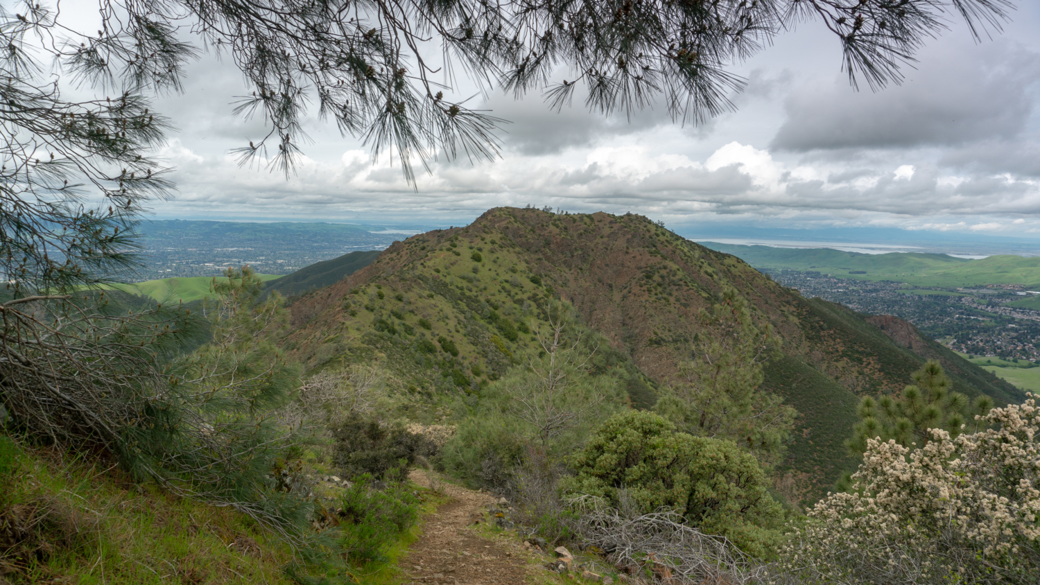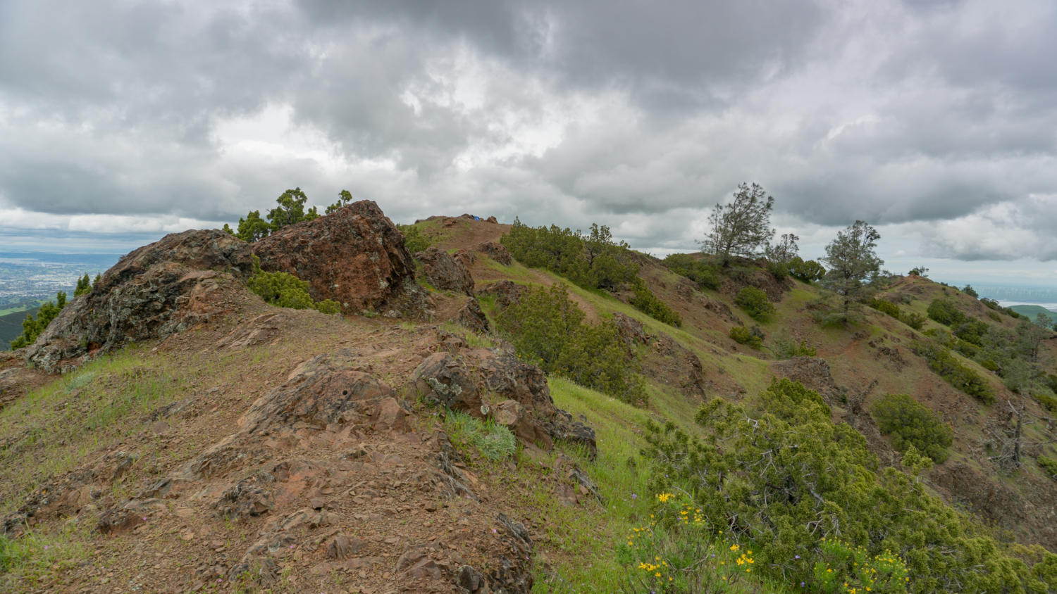 After one last stretch of steep rock, reach Eagle Peak at 5.5 miles and 2,369 feet. Rock outcrops here make great sites for picnicking, with views northwest of Mount Tamalpais on a clear day and the Mount Diablo foothills. Behind you to the south is the M-shaped outline of North Peak and Mount Diablo summit, where you can just make out the summit beacon.