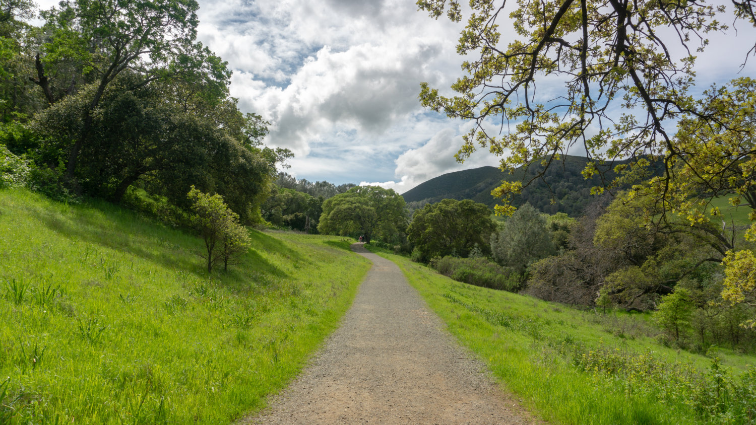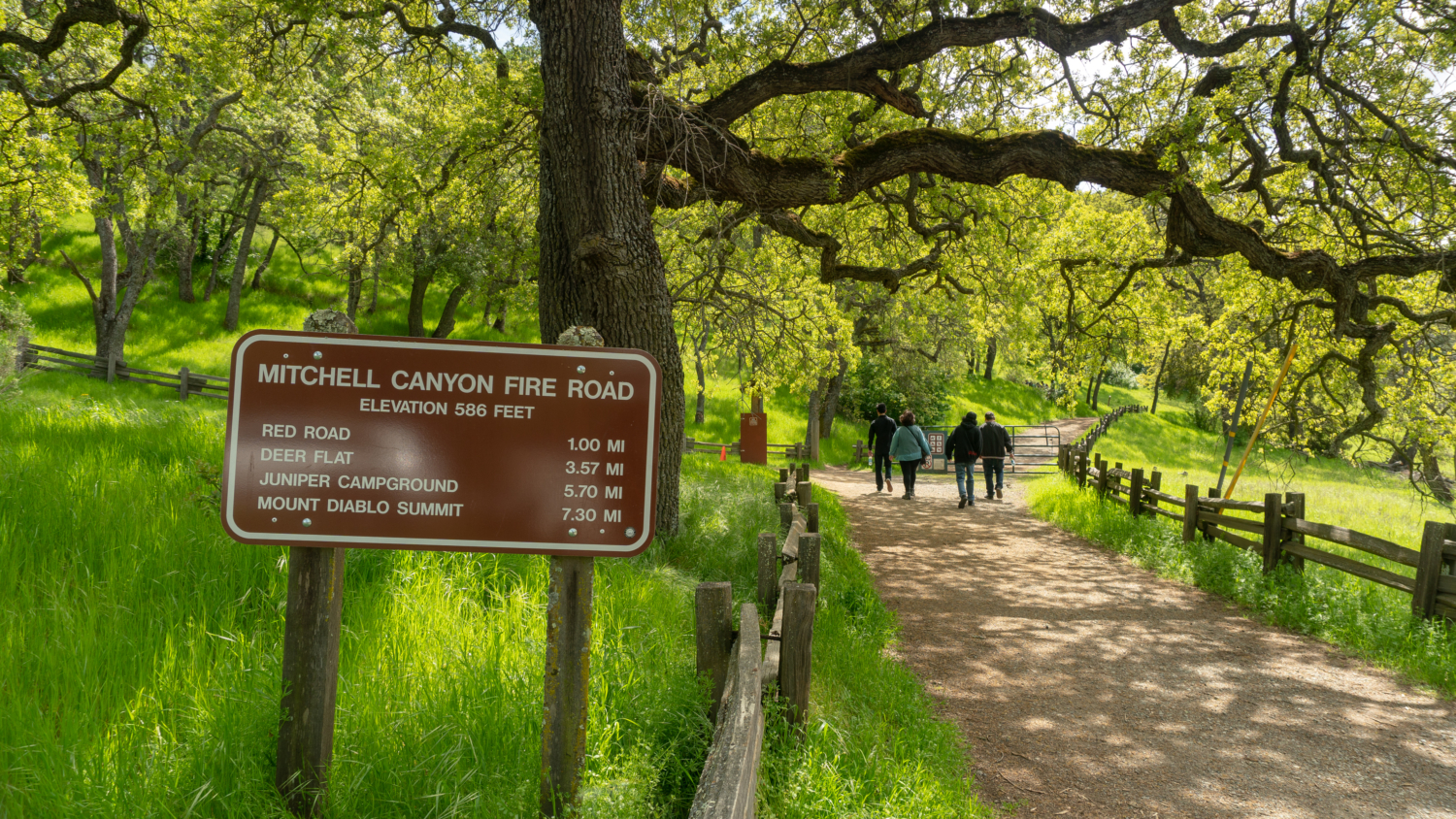 The Mitchell Canyon Trailhead and fire road surrounded by vibrant greens in spring.