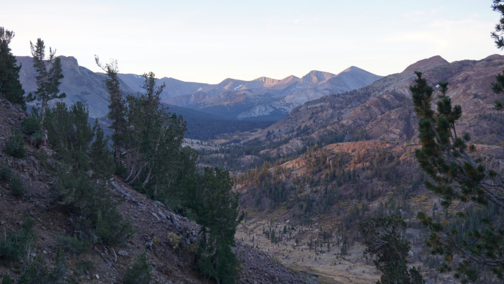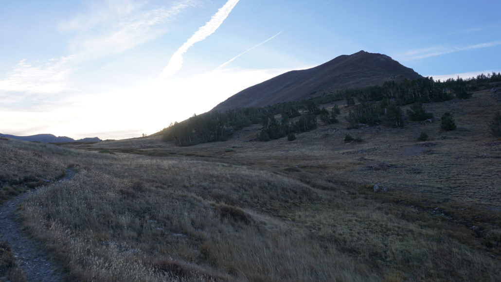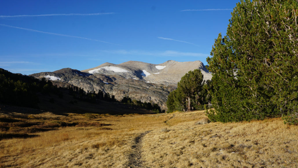 At the 0.3 mile mark, the trail joins the sometimes-dry outlet creek draining Gardisky Lake. Sparse patches of quaking aspen and willow add a dash of fall color, and views toward Tioga Pass and Mt. Dana join the views you were already enjoying toward Mt. Conness. The trail switchbacks along the bank of this creek, and just when you think you’ve had about enough of the steep climb (about 0.5-0.6 mile), the incline becomes less severe before entering a narrow meadow.