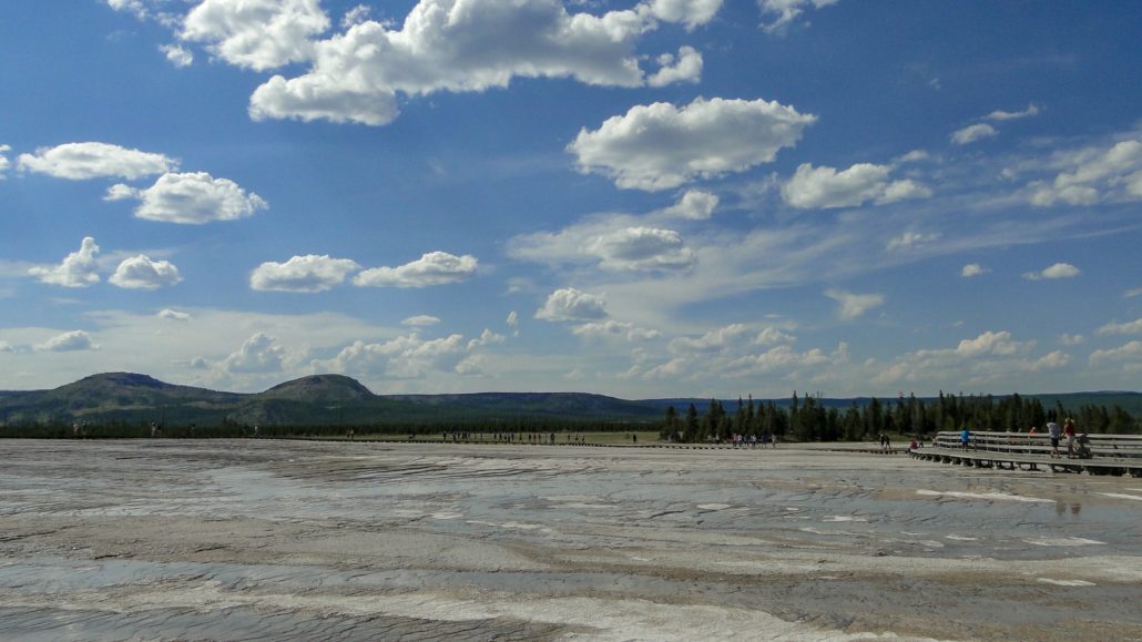 Do you like it when nature gets weird? Like, fried-on-acid-tie-dyed-reflections-of-passing-clouds-in-the-boiling-limestone-terrace-water weird? Well, if you want to see some of the weirdest scenery nature has to offer in a place that’s jam-packed full of weird stuff, stop at Grand Prismatic Spring to see Yellowstone’s biggest and most colorful hot spring.