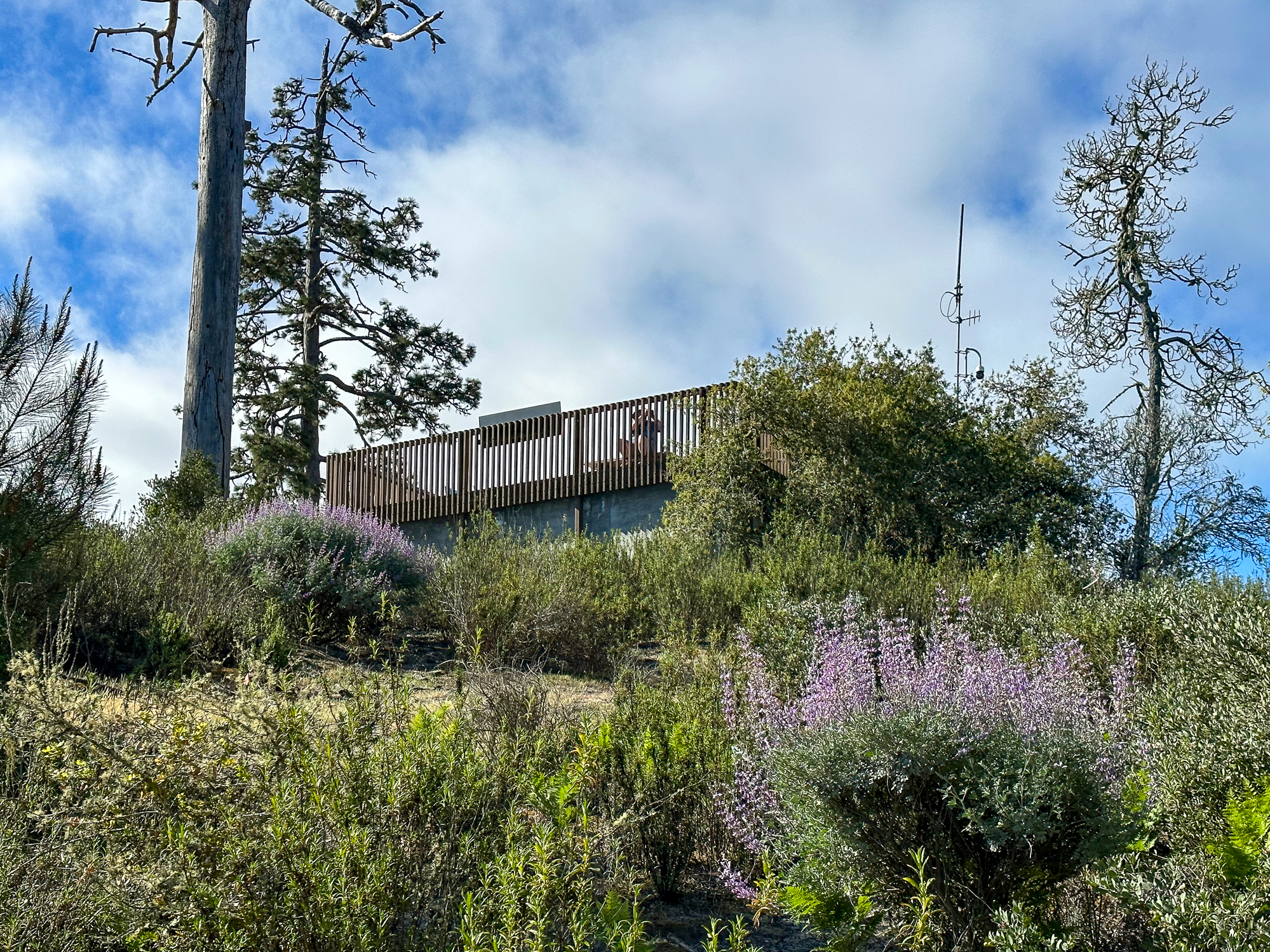 At 2.2 miles, turn right onto the Pine Trail toward the Observation Deck. To your left, campsites from Henry Cowell Campground are visible through a thin part of the forest. Pretty purple lupine bloom along the trail in spring beneath tall ponderosa pine. Near the top of the trail, the canopy opens and the trail is fully exposed to the sun.