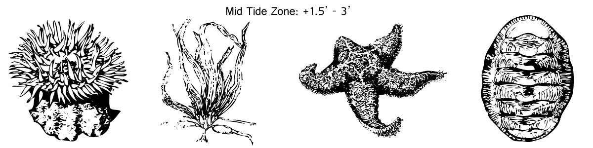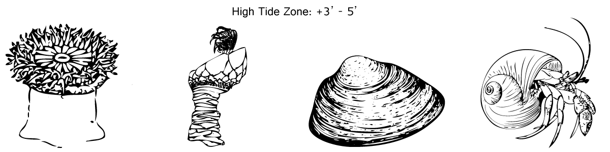 The intertidal zone (the coastline which resides between the highest high tide and the lowest low tide) consists of three levels; the high tide (upper mid-littoral) zone, the middle tide (lower mid-littoral) zone, and the low tide (lower littoral) zone.  Above the high spring tide level is the splash (upper littoral) zone.  Each zone houses it’s own set of creatures which have adapted specifically for that environment.